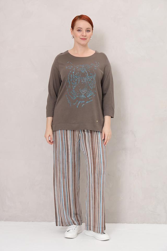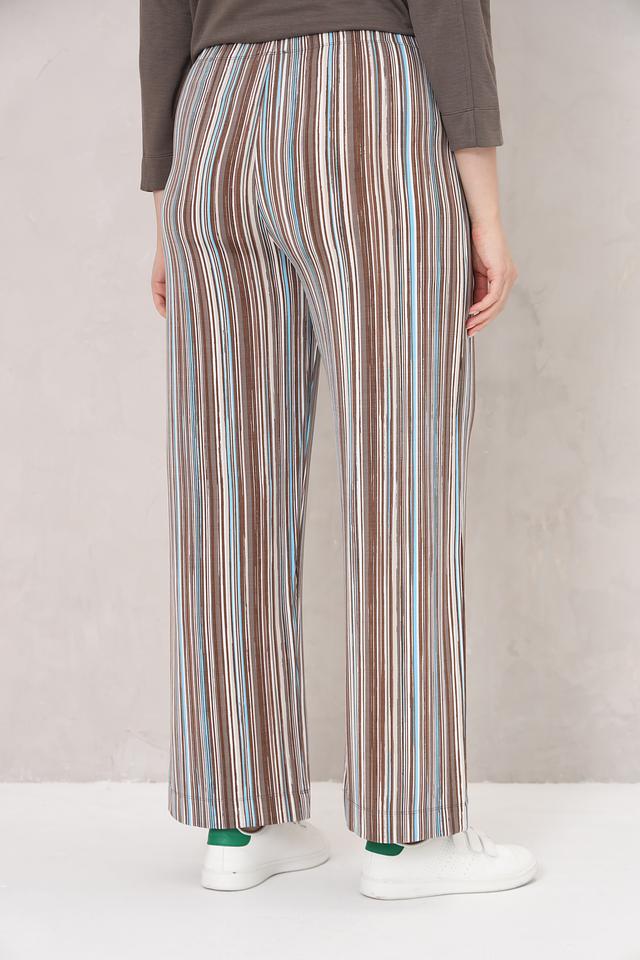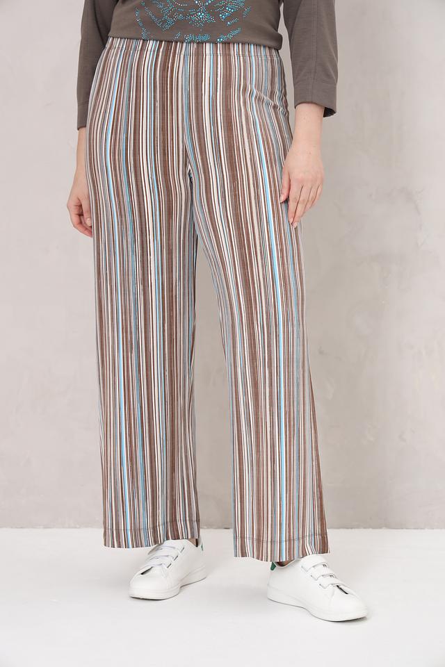 Женские брюки Frapp коричневого цвета с ярким полосатым принтом. Модель выполнена из мягкой вискозы с добавлением эластана, обеспечивающего комфортную посадку и свободу движений. Состав: вискоза 92%, эластан 8%