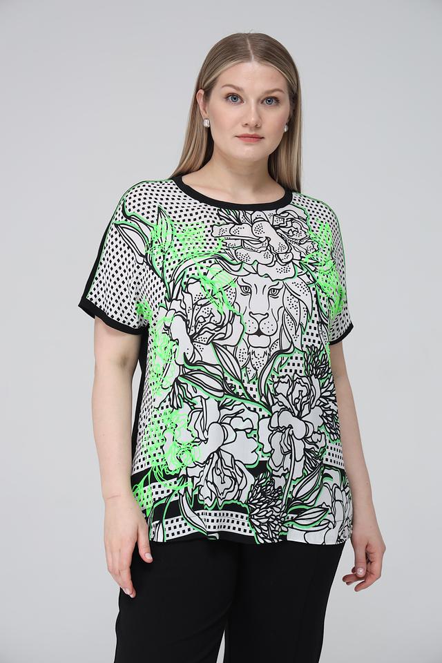 Блуза Frapp белого цвета с ярким принтом льва и геометрическим узором станет стильным дополнением вашего гардероба. Модель свободного кроя выполнена из мягкой вискозы с добавлением эластана для комфорта. Состав: вискоза 90%, эластан 10%