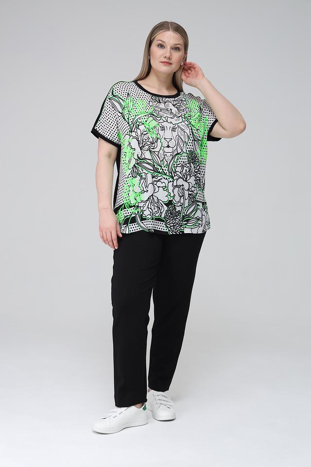 Модель имеет свободный крой, который не сковывает движений и обеспечивает удобную посадку по фигуре. Короткие рукава и округлый вырез горловины делают блузу универсальной и подходящей для различных образов.