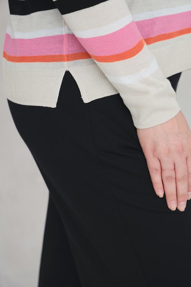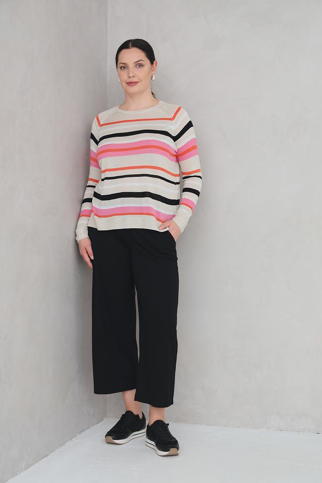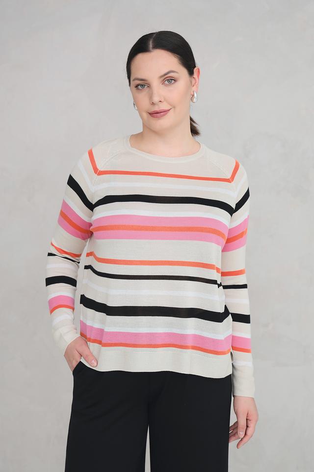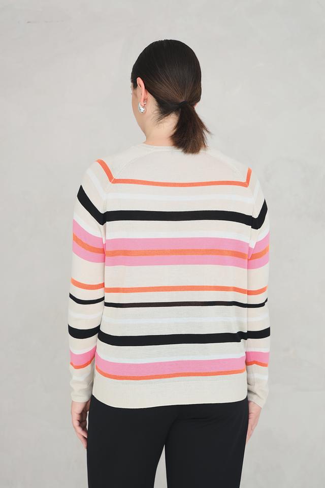 Этот стильный пуловер от Frapp выполнен в актуальной полосатой расцветке, сочетающей в себе бежевый, чёрный, розовый и оранжевый цвета. Он станет ярким акцентом в вашем образе и подчеркнёт вашу индивидуальность.