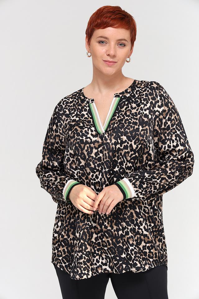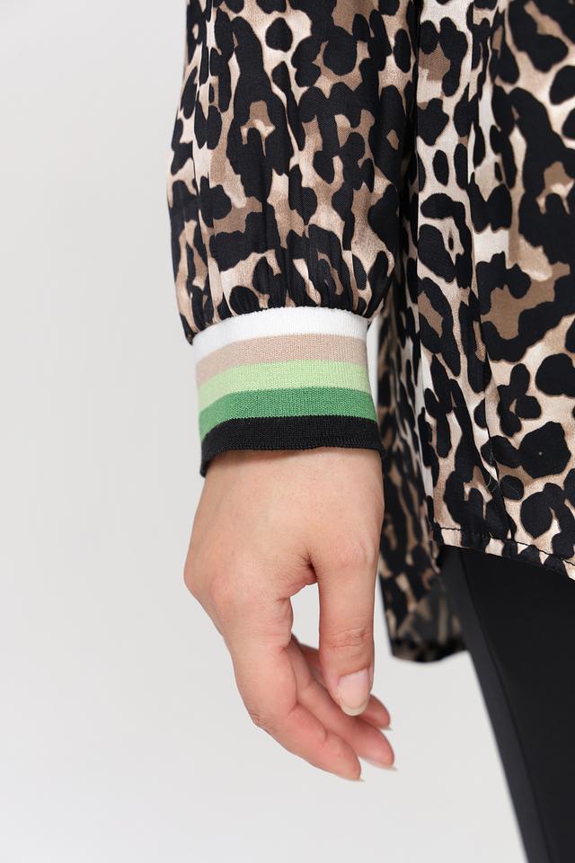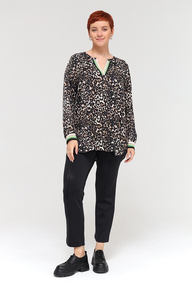 Блуза имеет свободный крой, который не сковывает движения. Привлекательный леопардовый принт делает эту модель яркой и запоминающейся. V-образный вырез блузы обрамлен зелёной отделкой, а манжеты рукавов украшены полосками в тон.