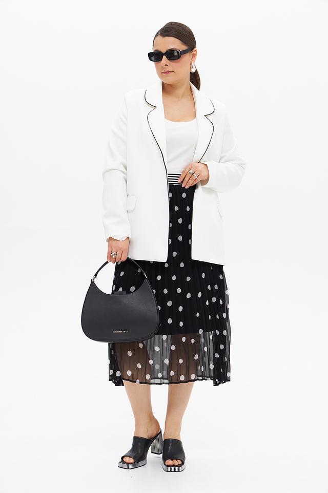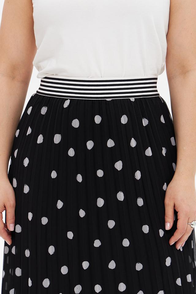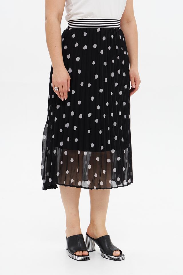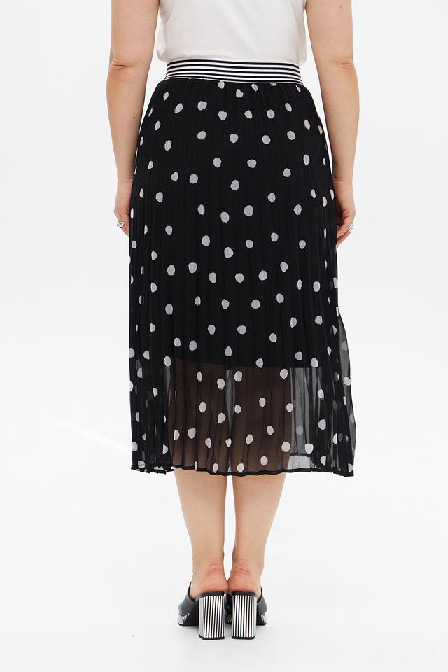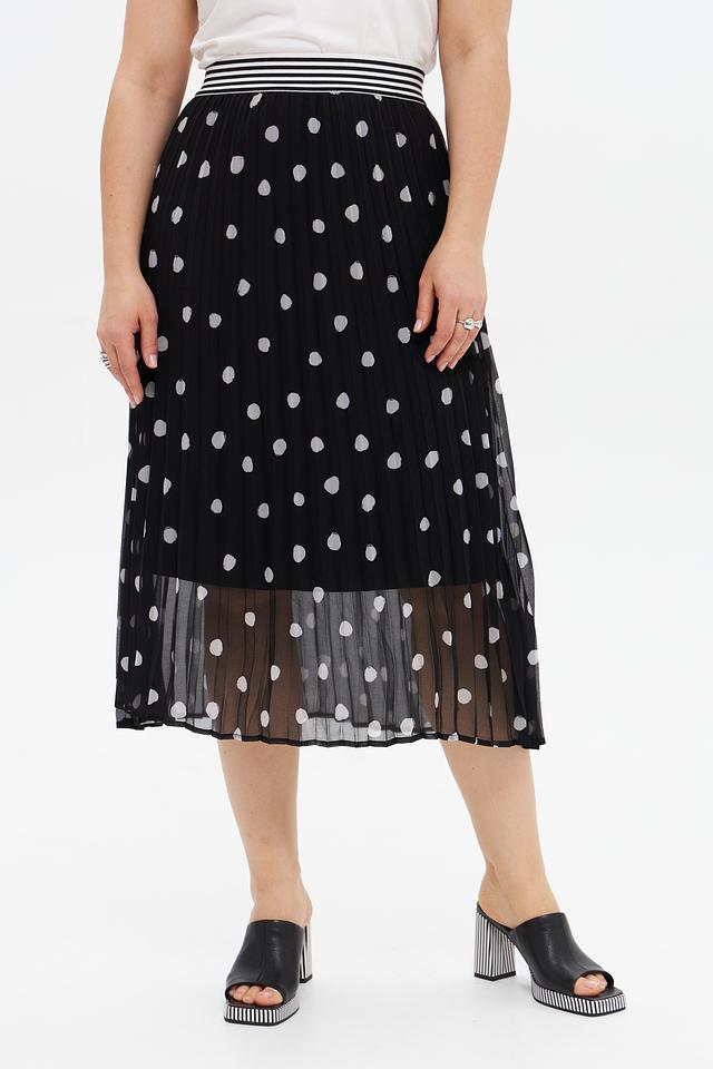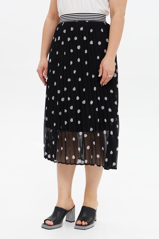 Юбка Frapp чёрного цвета с белым горошком – это стильная и лёгкая модель плиссе с эластичным поясом. Идеально подходит для создания женственных образов в повседневном стиле. Состав: полиэстер 100%