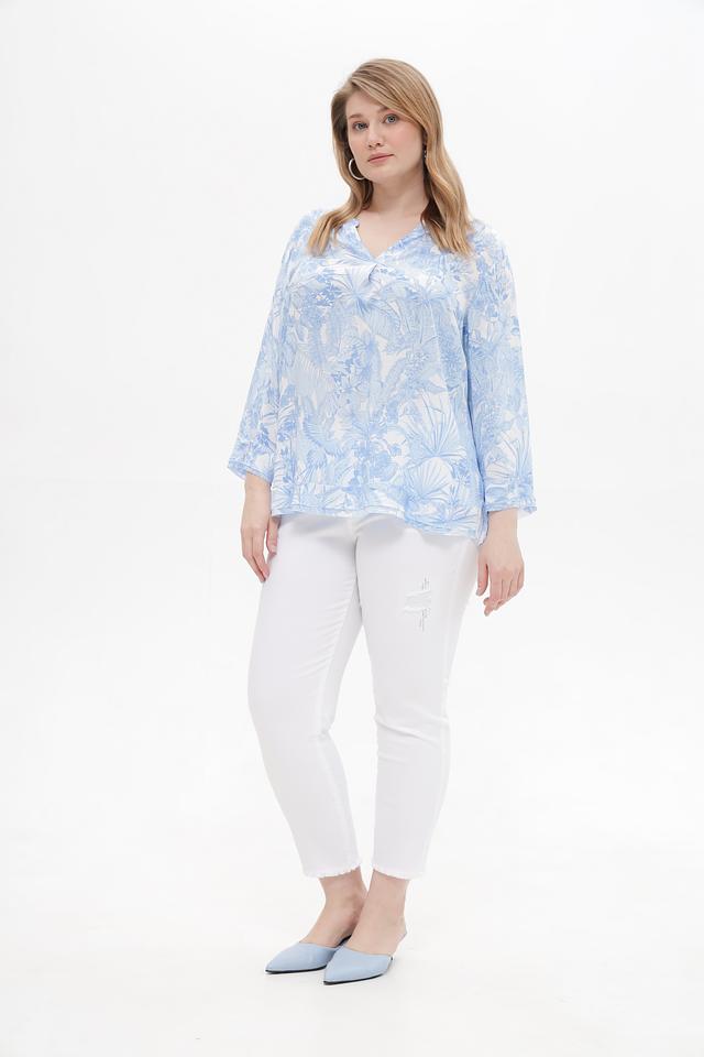 Особенностью этой блузки является ее яркий цветочный принт в голубых тонах, который придаст вашему образу свежесть и женственность. Она идеально подойдет для создания повседневных образов, а также для особых случаев. Блузка отлично сочетается с брюками, юбками и джинсами.