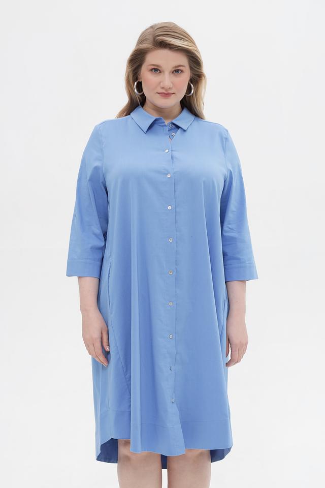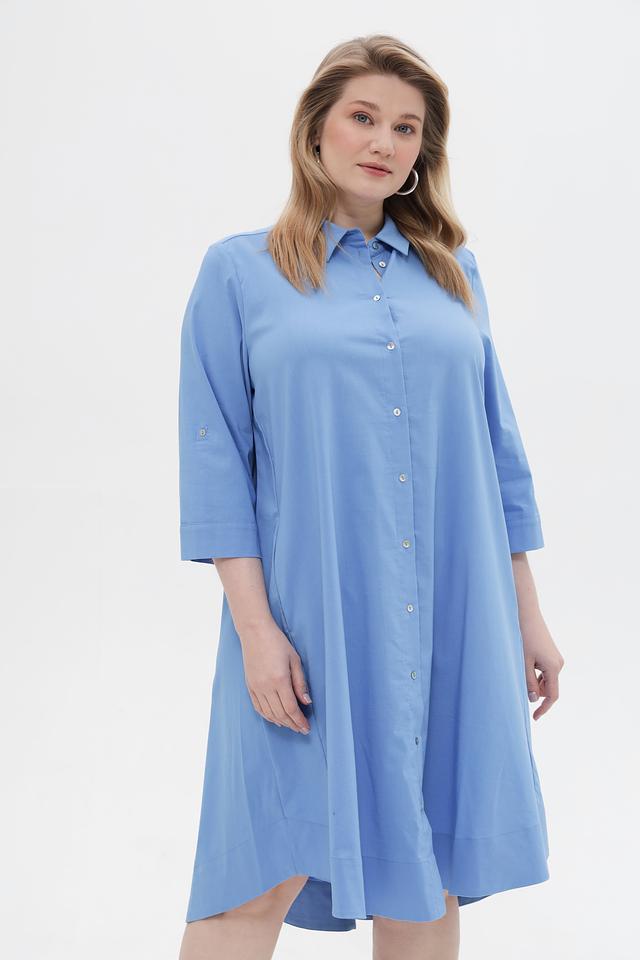 Модель имеет прямой силуэт, воротник рубашка и застегивается на пуговицы по всей длине. Рукава длиной 3/4 с манжетами, которые можно регулировать при помощи пуговиц. Платье имеет асимметричный подол, который придает образу динамичность.