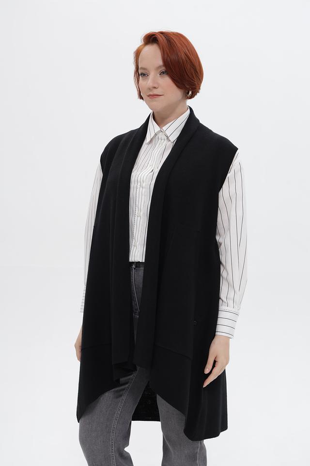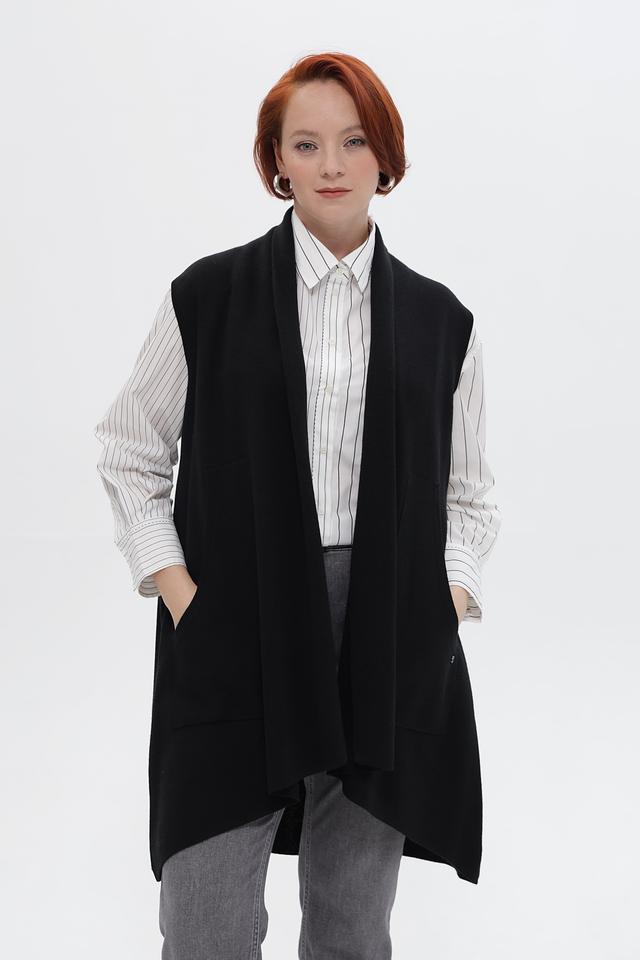 Черный удлиненный жилет Frapp выполнен из мягкого трикотажа с добавлением шерсти. Модель имеет свободный крой и открытые полочки, идеально подходит для создания многослойных образов. Состав: полиакрил 70%, шерсть 30%