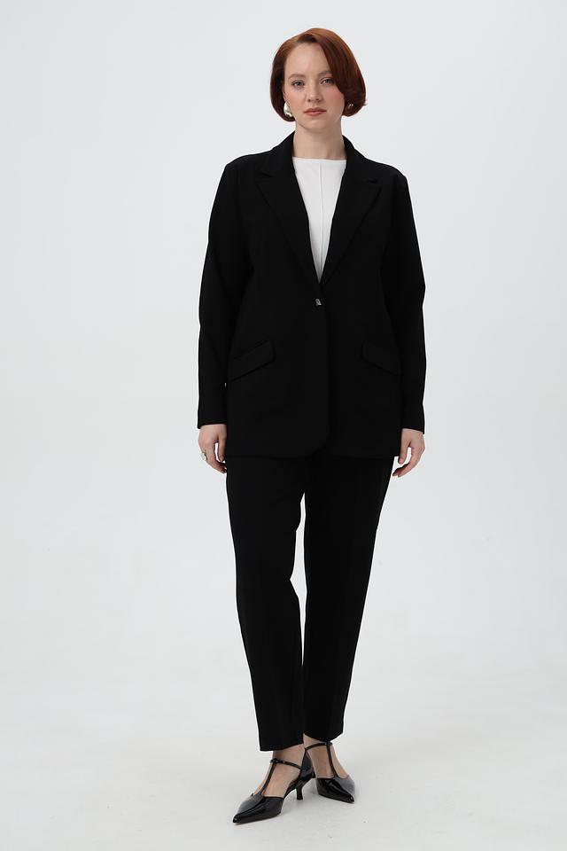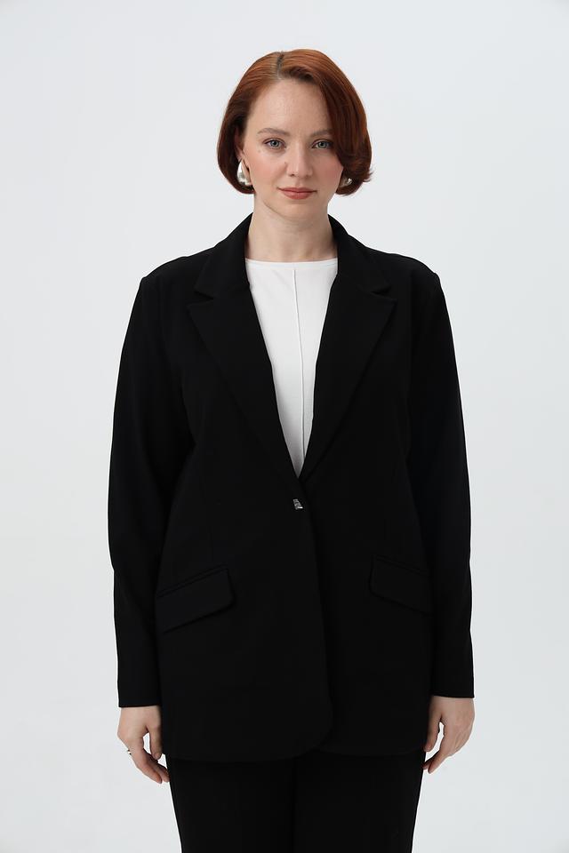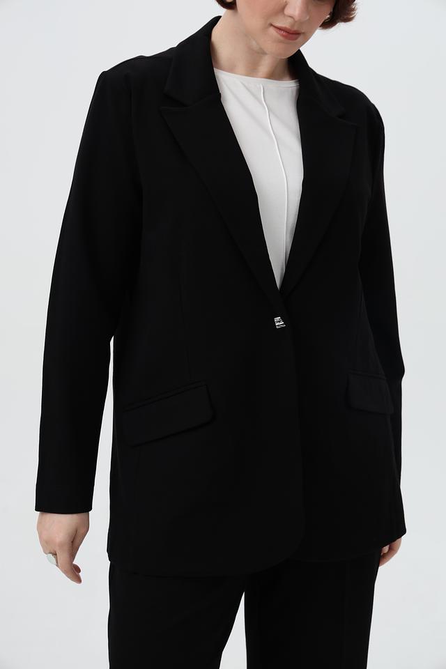 Классический чёрный жакет Frapp оверсайз кроя — идеальный выбор для создания стильных и современных образов. Модель имеет лаконичный дизайн без лишних деталей, что делает её универсальной и подходящей для различных случаев.