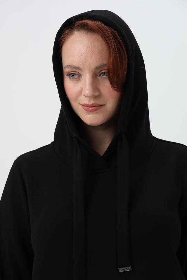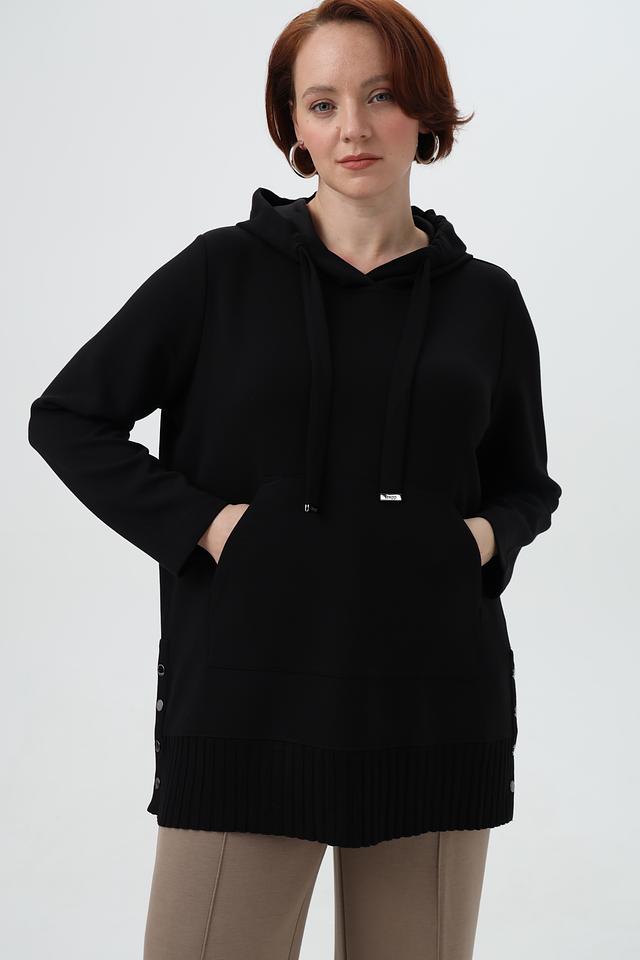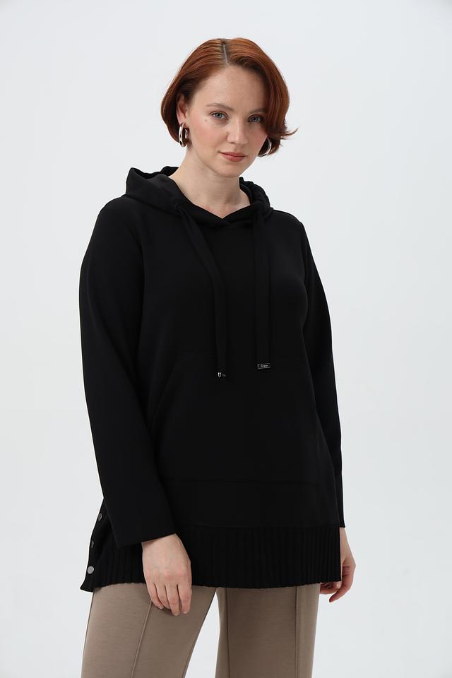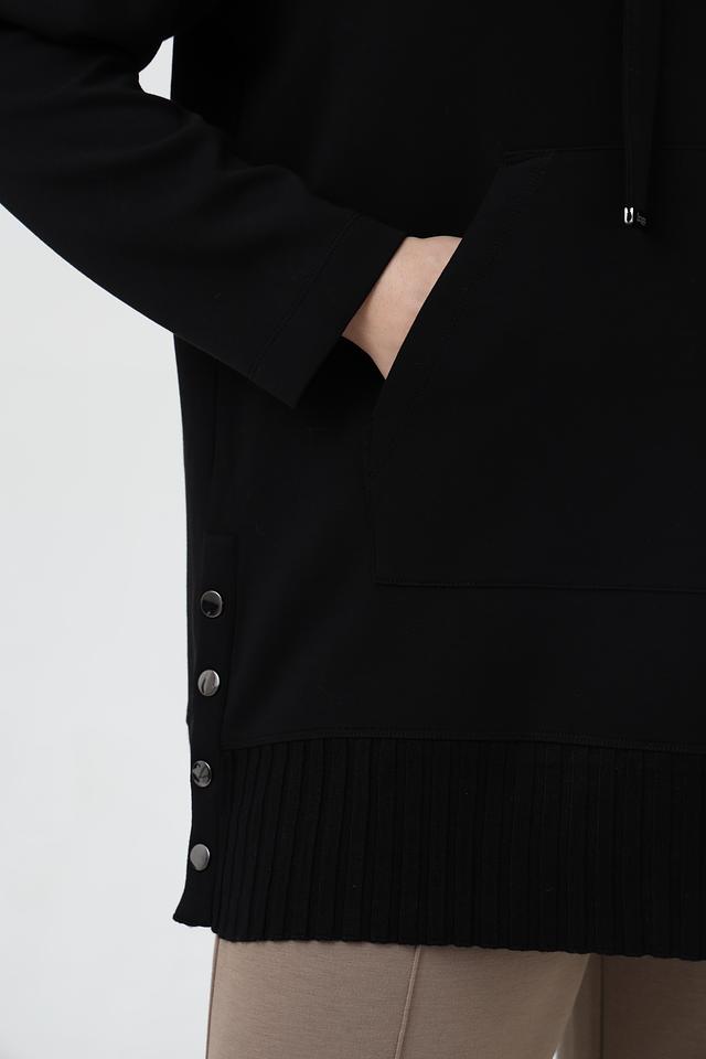 Худи имеет капюшон со шнурками для регулировки, а также вместительный карман. Оригинальным элементом дизайна являются разрезы по бокам с застёжкой на пуговицы, которые добавляют образу динамичности. Внизу худи расположена вязка-резинка.