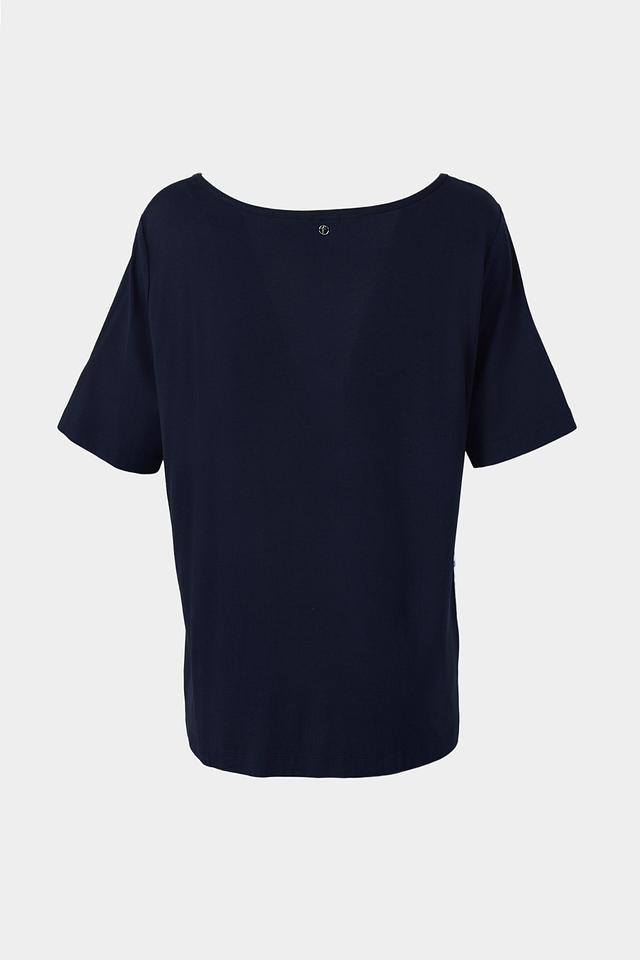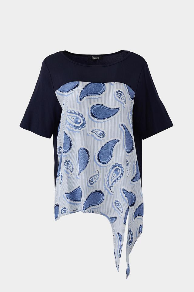 Модель имеет свободный крой, короткие рукава и круглый вырез горловины. Верхняя часть футболки выполнена в насыщенном синем цвете, а нижняя часть украшена оригинальным принтом в виде голубых узоров на белом фоне.