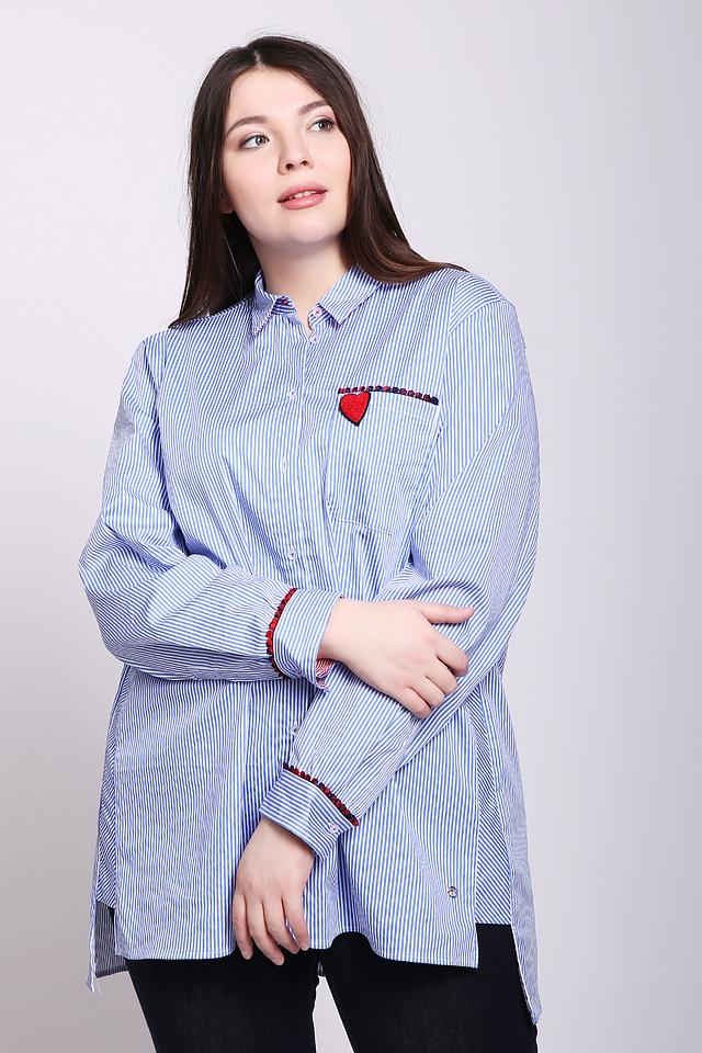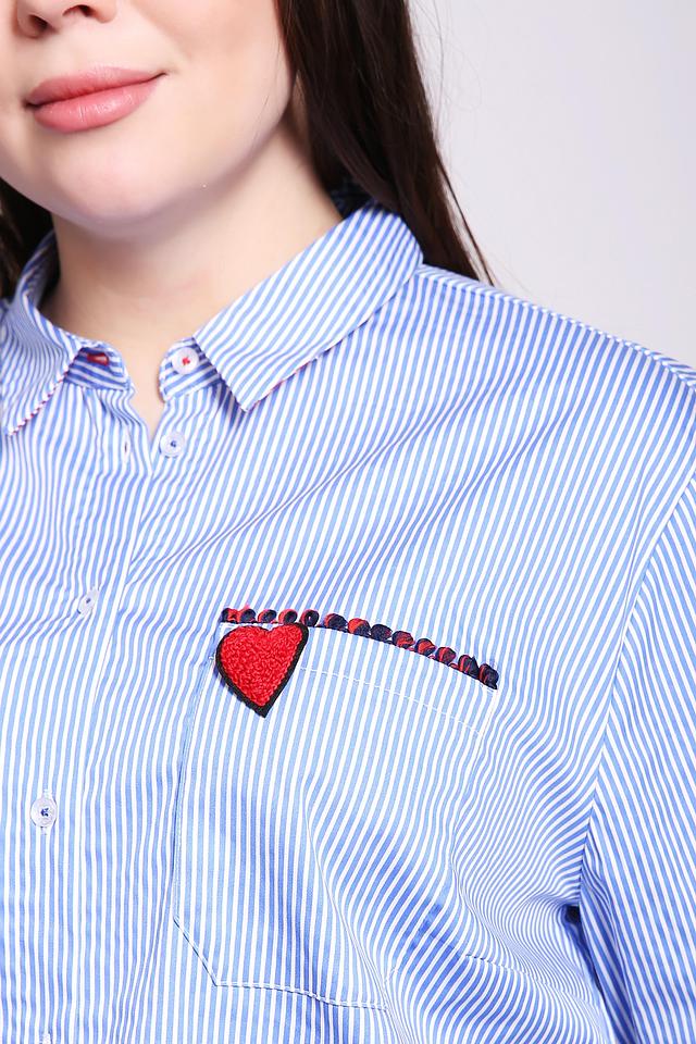 Женская рубашка Frapp голубого цвета в полоску, украшена вышивкой в виде сердца и надписью на спине. Стильный и комфортный выбор для повседневного образа. Состав: хлопок 75%, полиамид 22%, эластан 3%