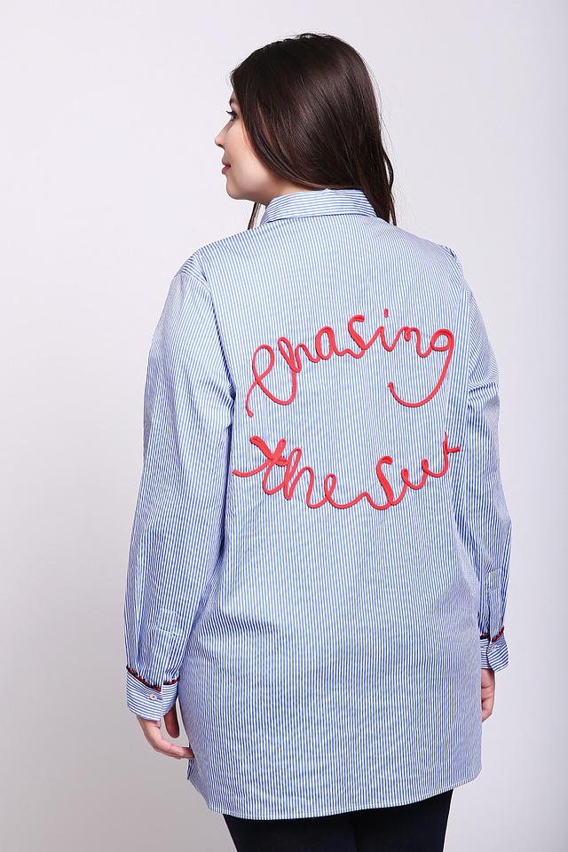 Рубашка имеет классический крой с длинными рукавами и воротником. Голубая полоска придает ей свежий и легкий вид. На груди расположена декоративная вышивка в виде красного сердца, а на спине – надпись “Chasing the sun” также выполненная красной вышивкой.
