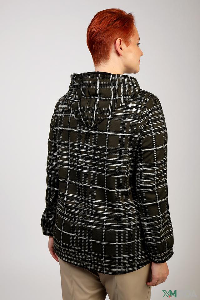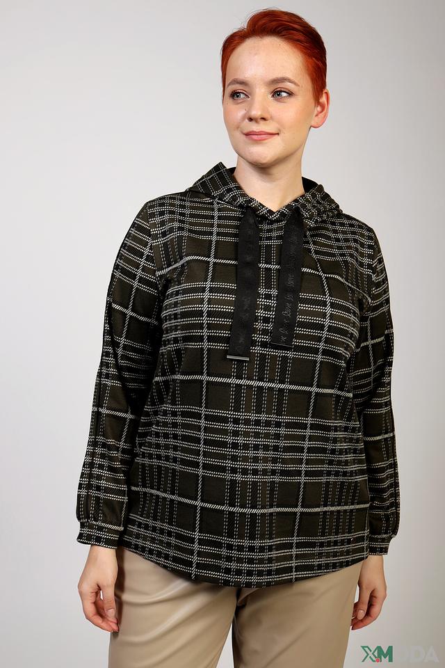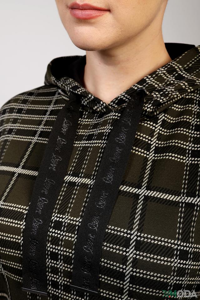 Пуловер имеет оливковый цвет и классический клетчатый рисунок, который придает ему актуальный и модный вид. Капюшон добавляет функциональности и позволяет создавать различные образы.