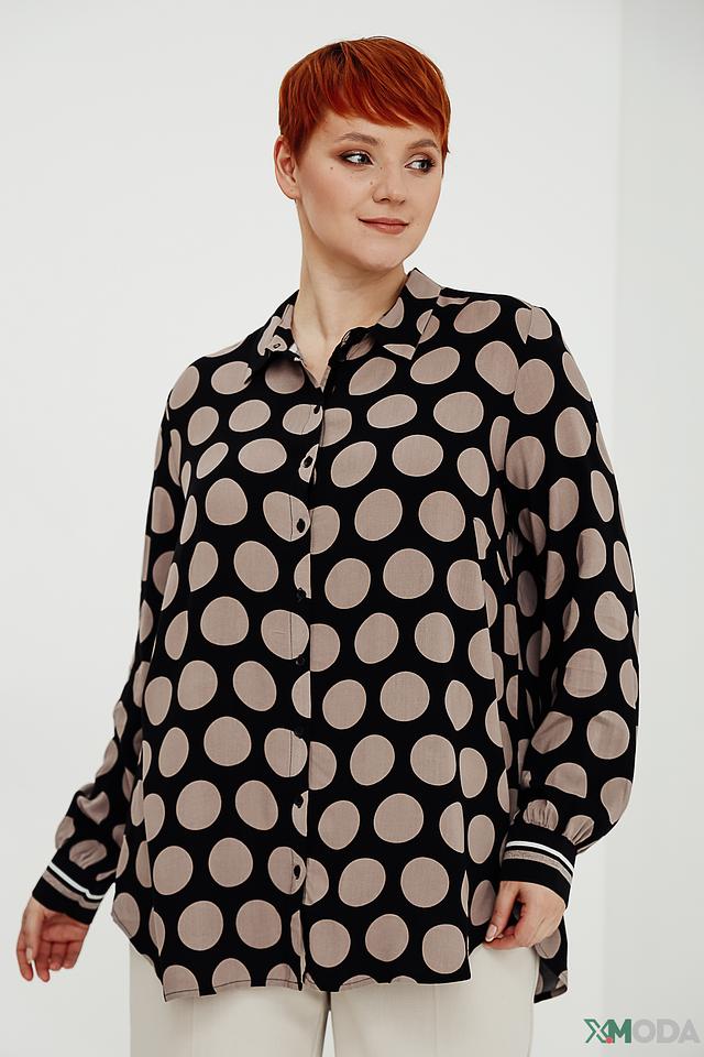 Рубашка имеет классический крой с длинными рукавами и отложным воротником. Её особенностью является принт в виде крупного бежевого горошка на чёрном фоне, который придает ей игривый и женственный вид. Манжеты рукавов отделаны контрастной полоской.