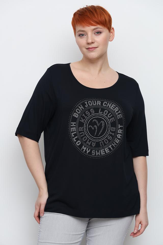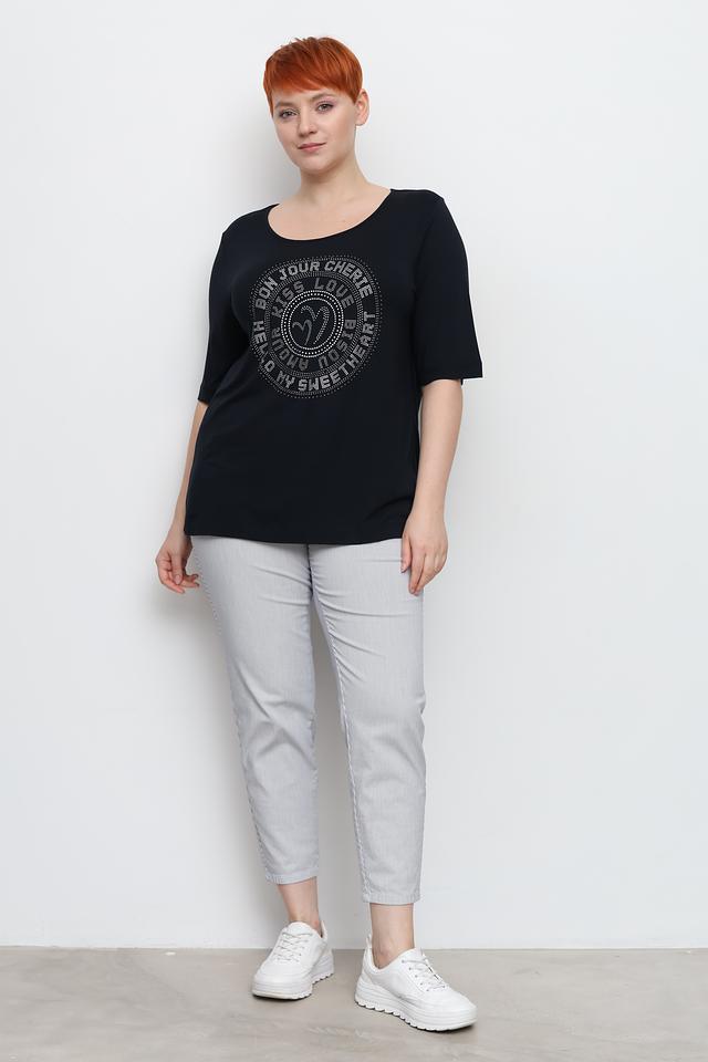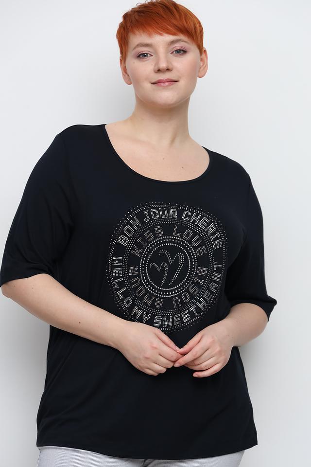 Основным украшением модели является крупный круглый принт, полностью выложенный мерцающими стразами. Принт выполнен в виде надписи на французском языке, что придает футболке особый шарм и изысканность.