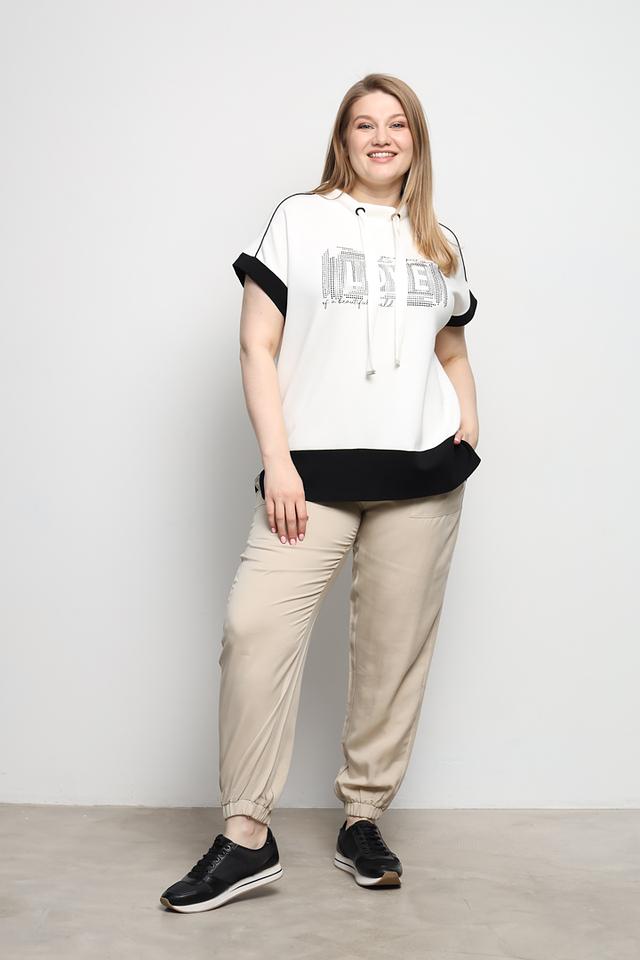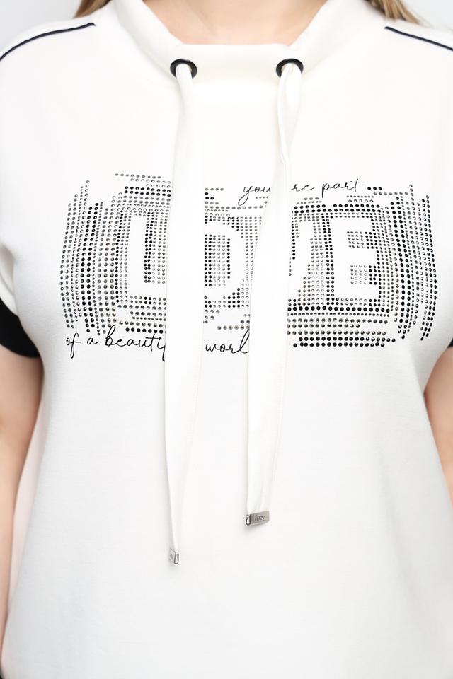 Толстовка имеет короткий рукав и удобный капюшон, который дополнен шнурками для регулировки. Главной особенностью данной модели является эффектный декор – надпись "LIFE", выполненная из сверкающих страз. Черная вставка в нижней части толстовки добавляет контраста и завершенности образу.