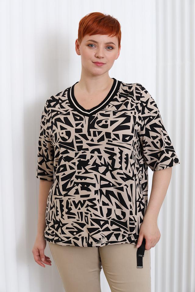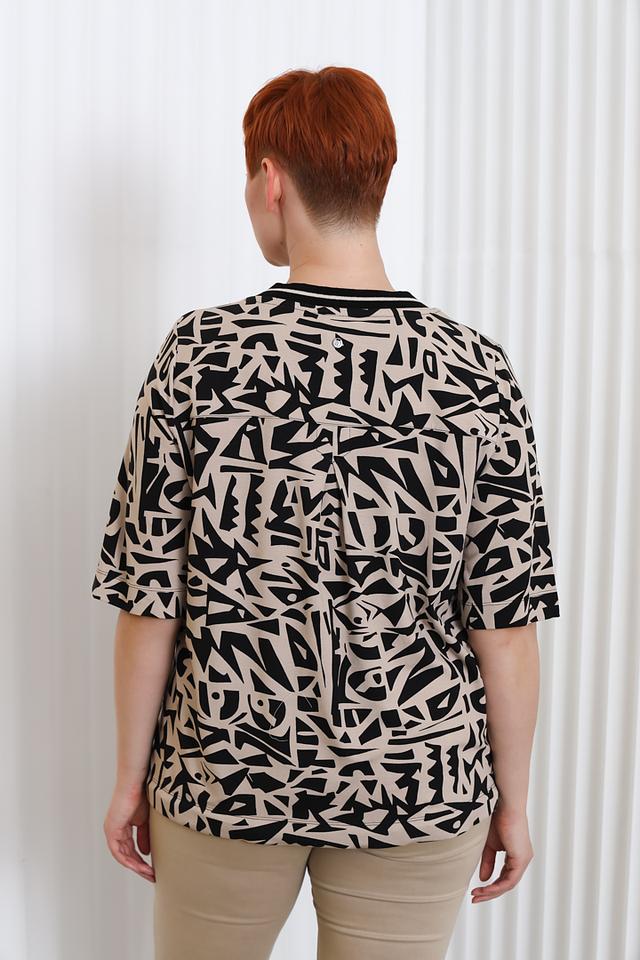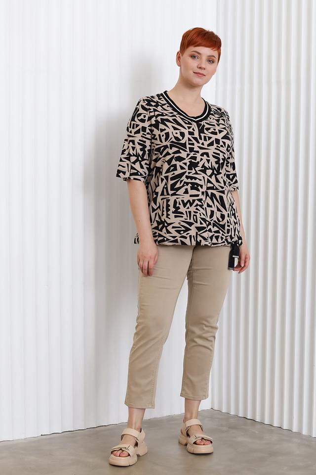 Блуза Frapp бежевого цвета с оригинальным абстрактным принтом. Модель имеет V-образный вырез горловины и короткий рукав, что делает ее отличным выбором для создания повседневных образов. Состав: вискоза 90%, эластан 10%