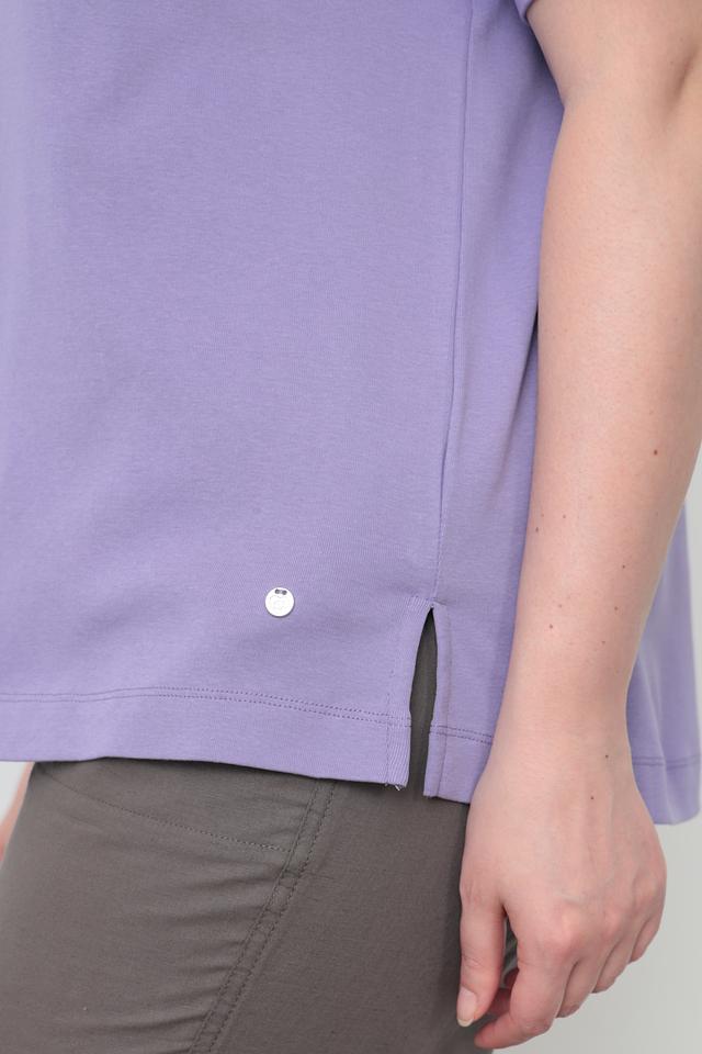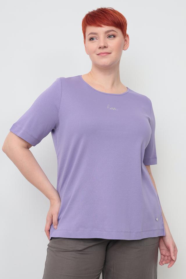 Футболка имеет лавандовый цвет и прямой крой, который подходит для любой фигуры. Короткий рукав делает ее идеальным выбором для теплой погоды. На груди присутствует небольшая вышивка с логотипом бренда, выполненная в тон изделия.