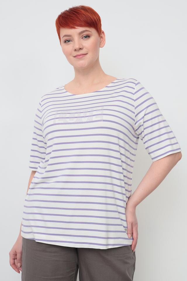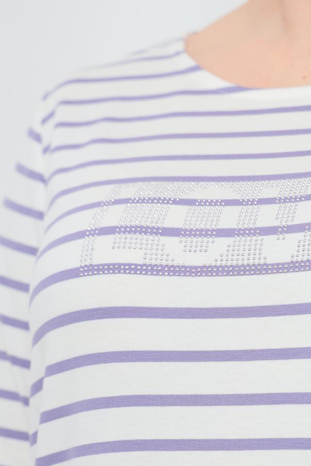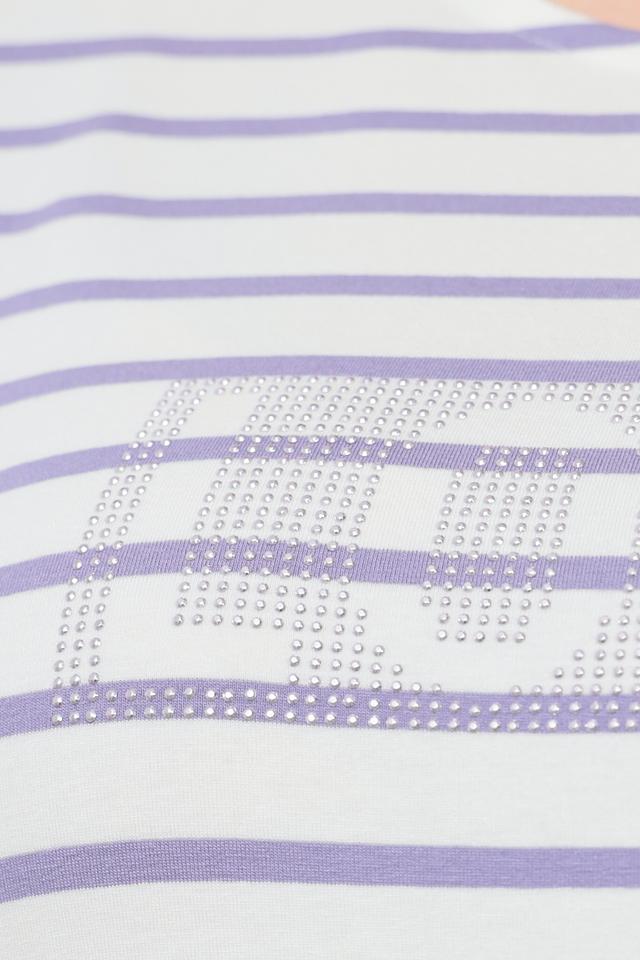 Женская футболка Frapp белого и лавандового цвета в горизонтальную полоску. Модель выполнена из мягкой вискозы с добавлением эластана, обеспечивающего комфортную посадку. Футболка украшена небольшим декором из страз. Состав: вискоза 90%, эластан 10%