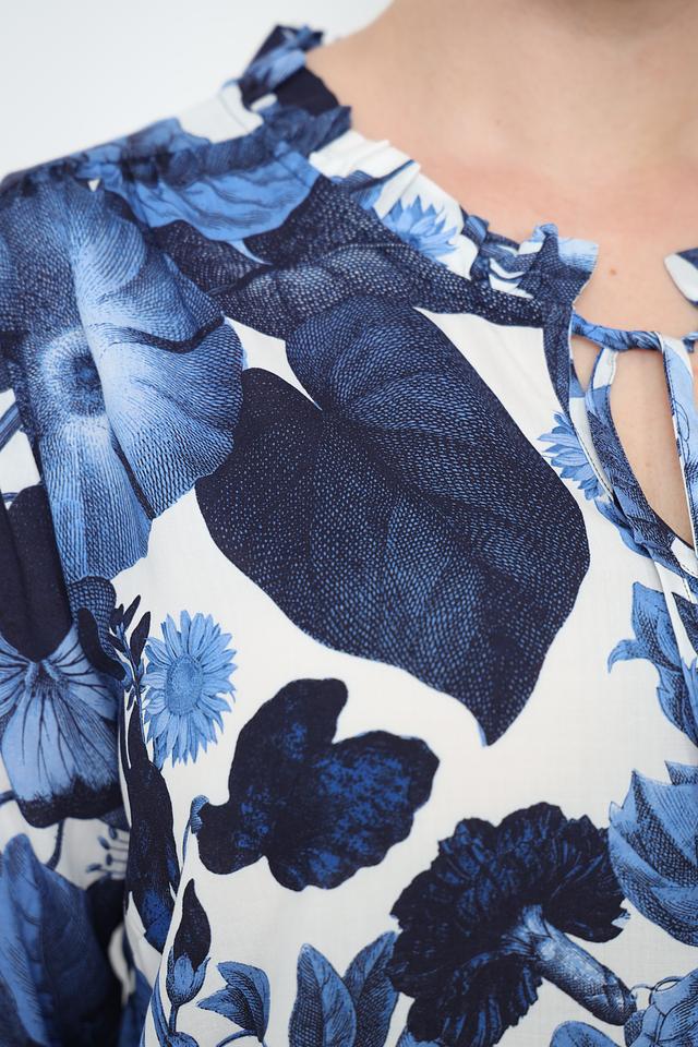 Блуза Frapp синего цвета с ярким цветочным принтом станет отличным дополнением к вашему гардеробу. Модель выполнена из мягкой вискозы, что обеспечивает комфорт в носке. Блуза имеет длинные рукава и V-образный вырез с завязками. Состав: вискоза 100%