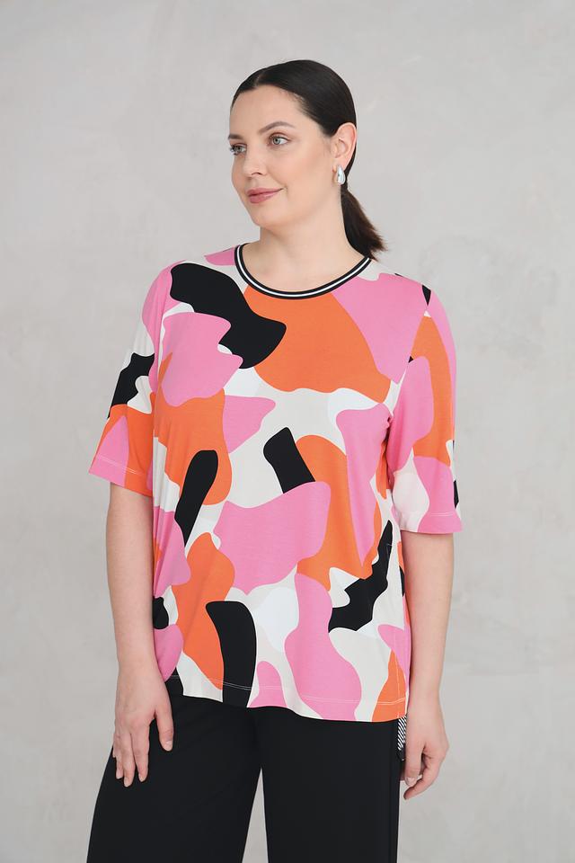 Женская футболка Frapp оранжево-розового цвета с ярким абстрактным принтом. Модель выполнена из мягкой вискозы с добавлением эластана, обеспечивающего комфортную посадку. Футболка станет стильным дополнением к вашему образу. Состав: вискоза 90%, эластан 10%