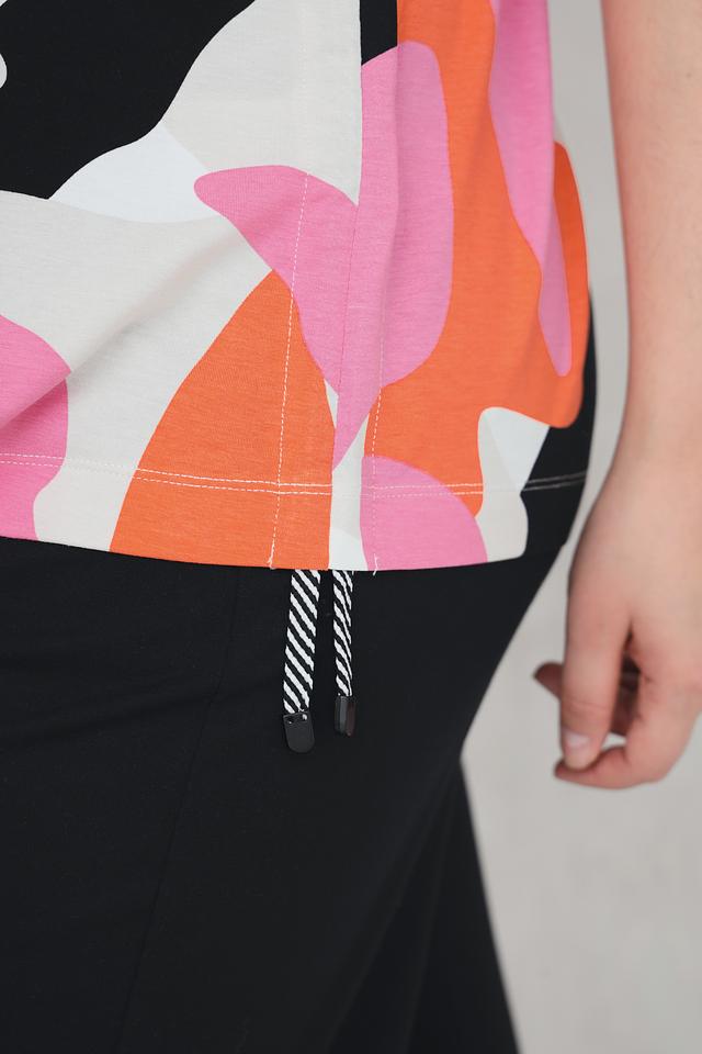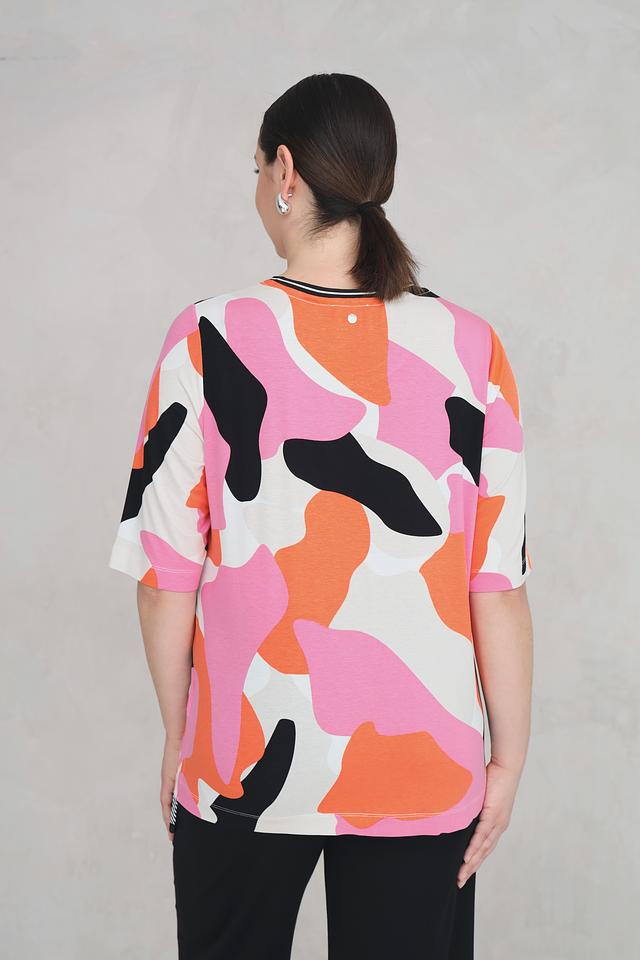 Футболка имеет свободный крой, который не сковывает движений и позволяет создать расслабленный образ. Яркий абстрактный принт в оранжево-розовой гамме с элементами чёрного и белого делает эту модель по-настоящему уникальной.
