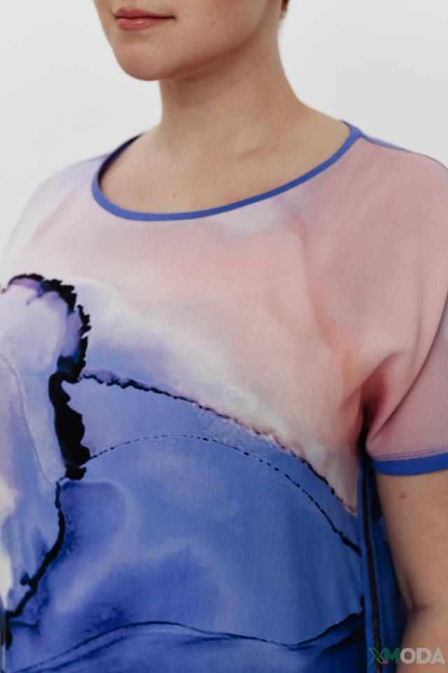 Особенностью этой модели является яркий и необычный принт в стиле абстрактной живописи, выполненный в оттенках синего, розового и фиолетового. Он придает футболке индивидуальность и делает ее отличным выбором для тех, кто любит выделяться из толпы.