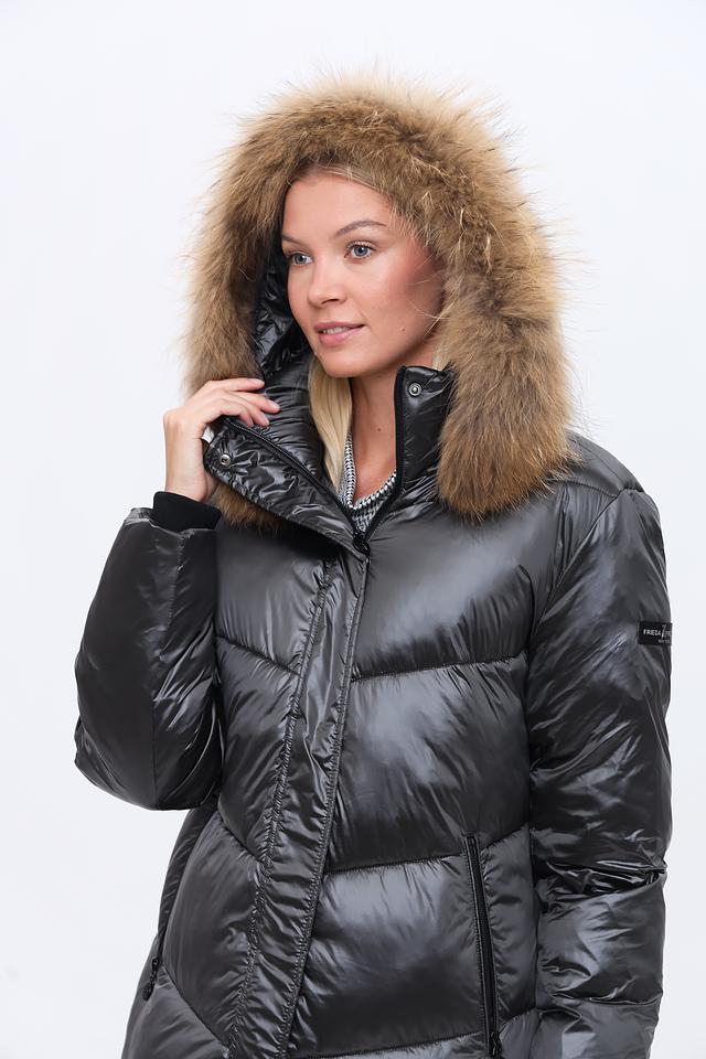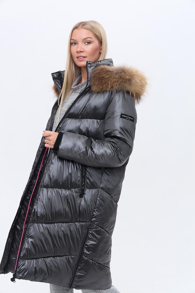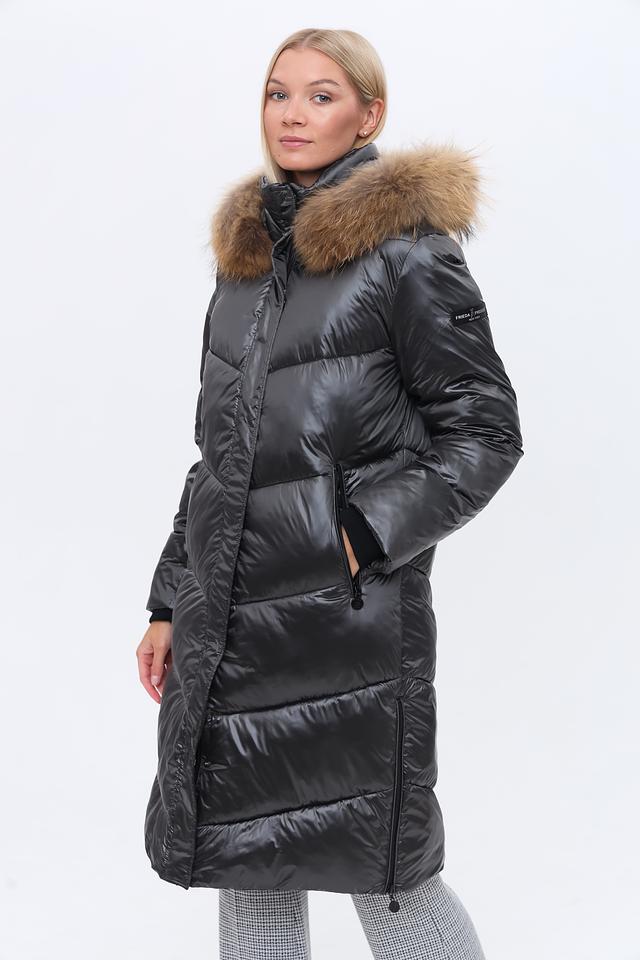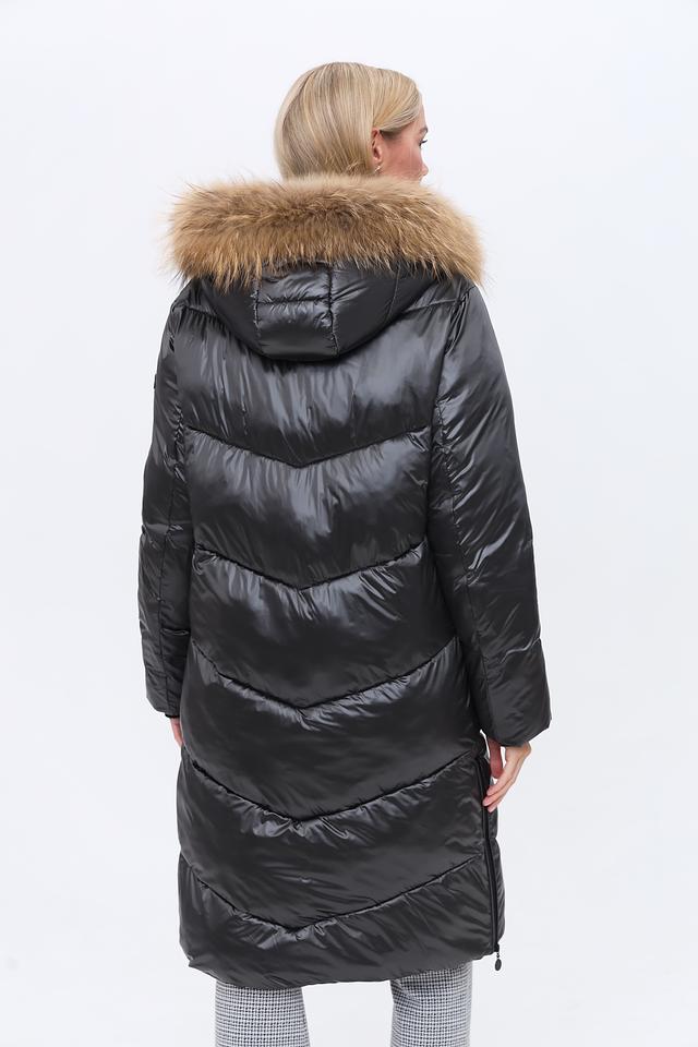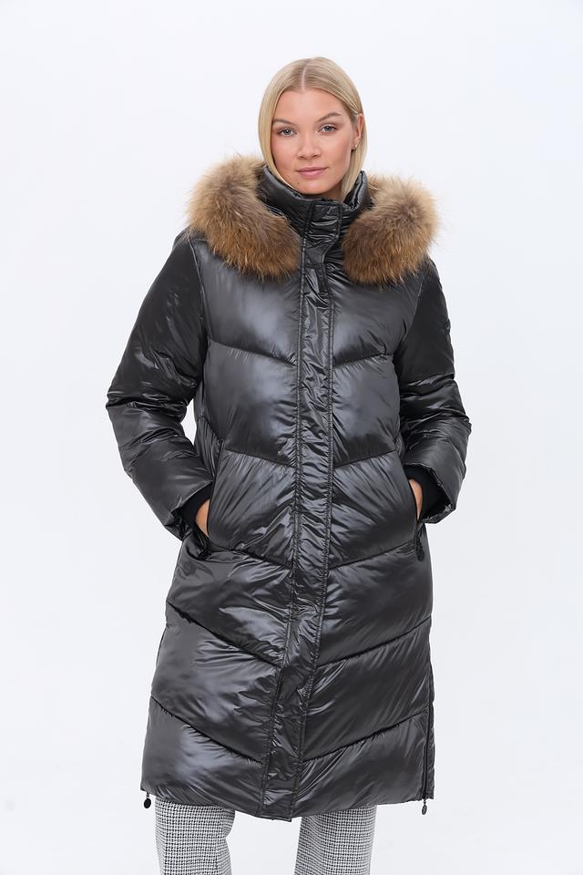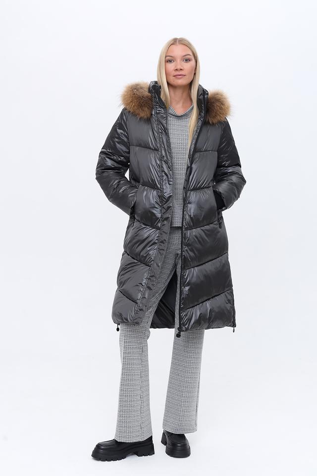 Пальто имеет стеганую фактуру, которая придает ему современный и стильный вид. Капюшон украшен роскошным мехом, который не только согревает в мороз, но и добавляет образу изысканности.