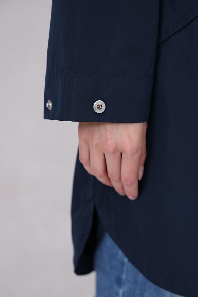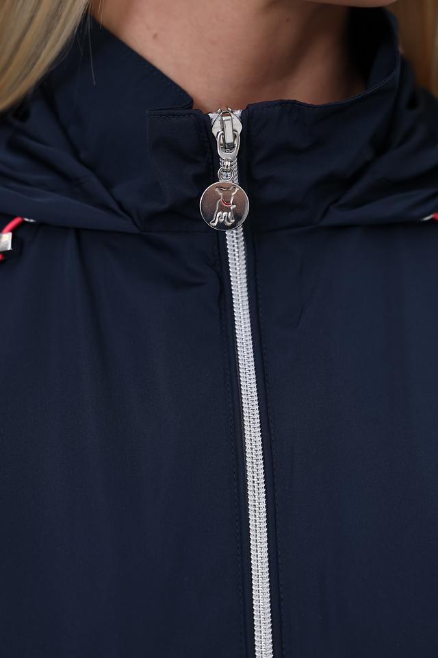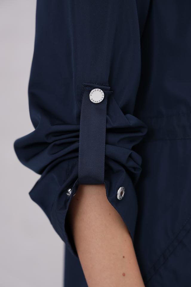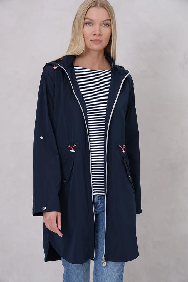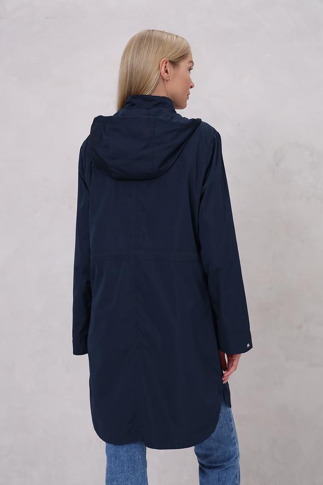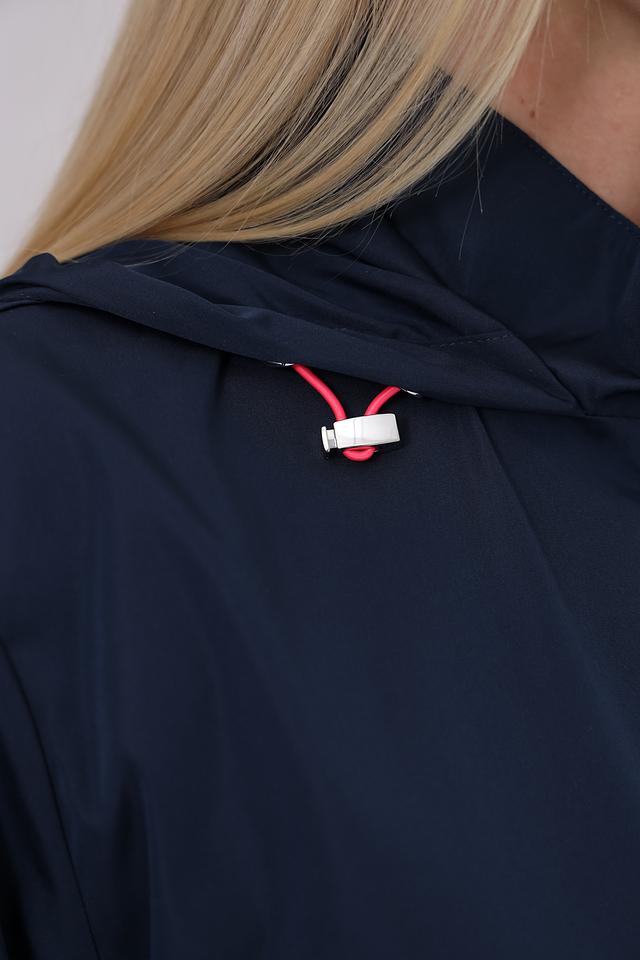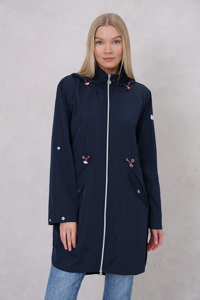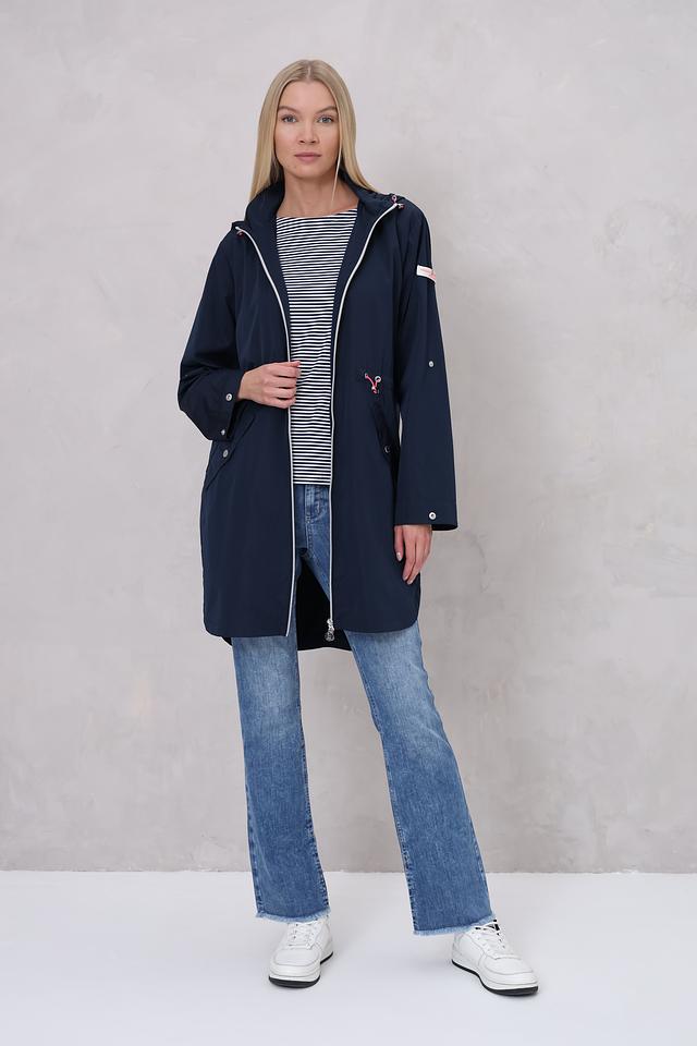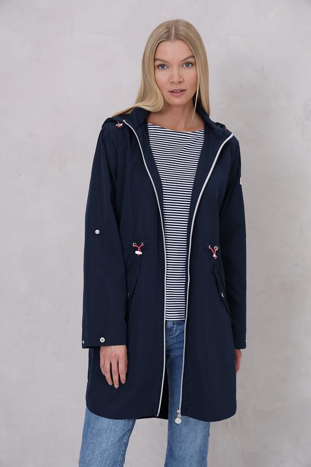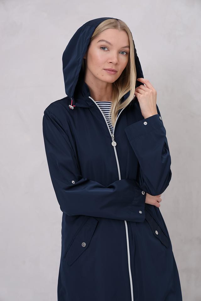 Плащ имеет удобный капюшон и застегивается на молнию. На рукавах и груди расположены декоративные аппликации в виде морских якорей, добавляющие модели оригинальности.