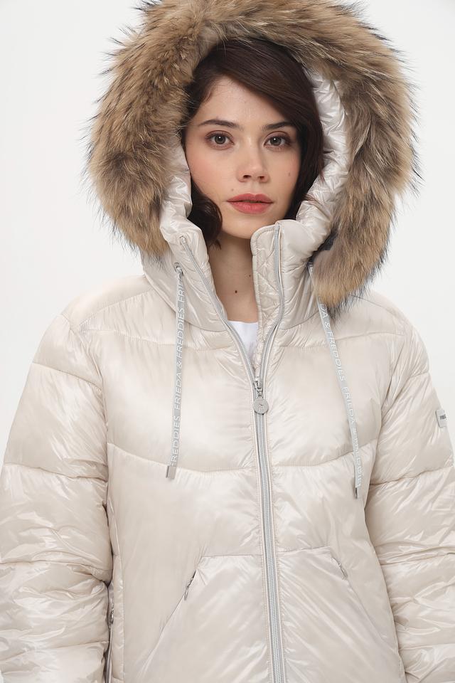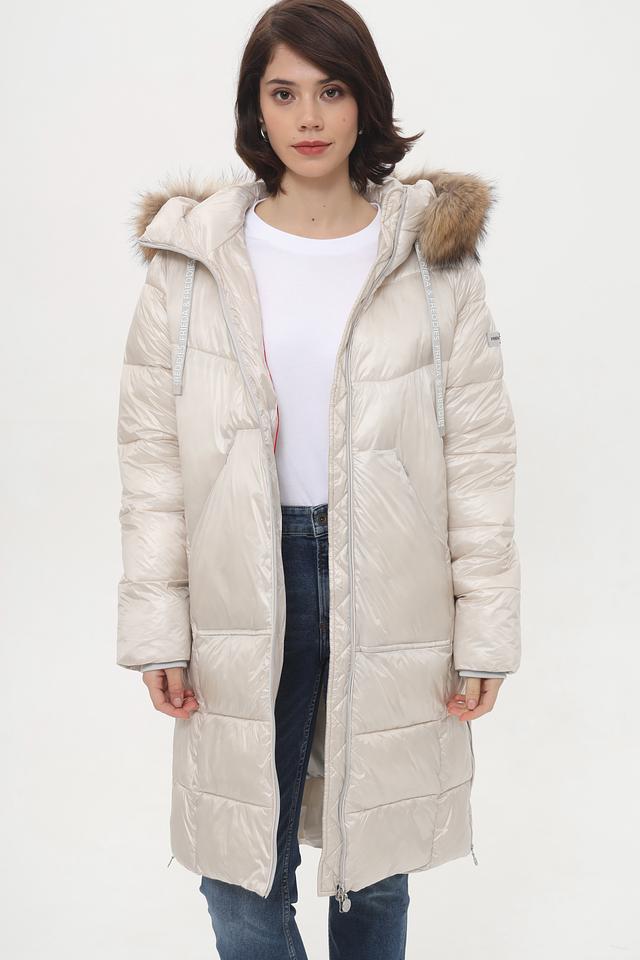 Модель имеет прямой крой, длину до середины и удобный капюшон, отделанный искусственным мехом.