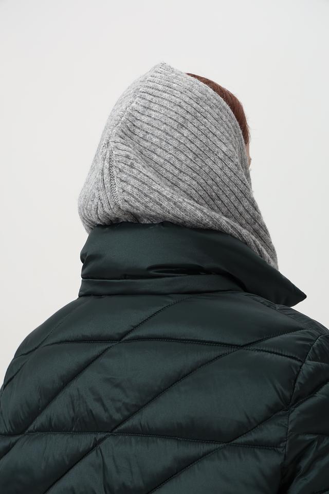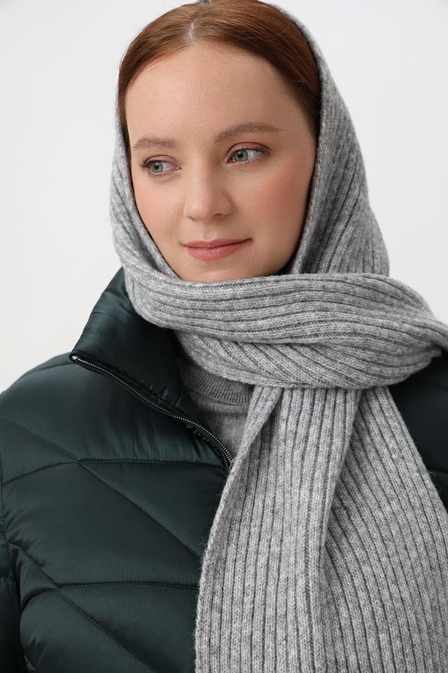 Шарф выполнен в сером цвете и имеет фактурную вязаную структуру. Его оптимальная длина позволяет носить его различными способами – классическим узлом, объемным шарфом или даже как капюшон, как показано на фото.