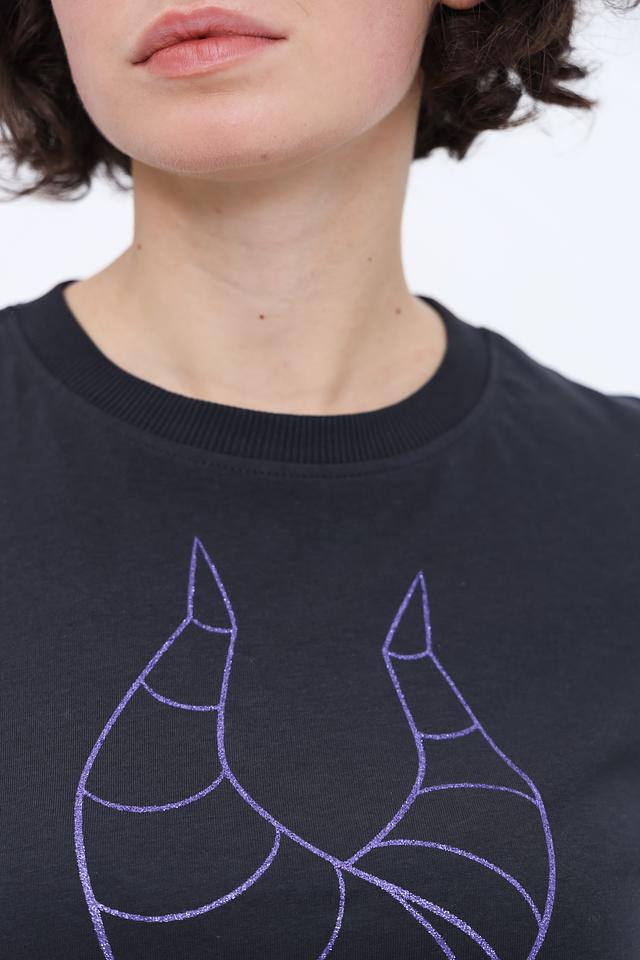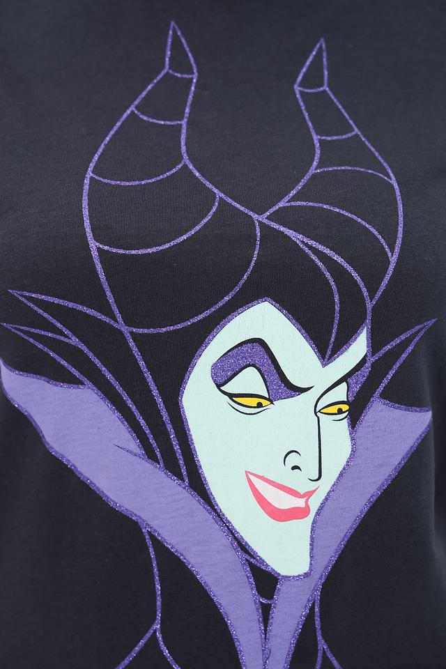 Основной цвет футболки – чёрный, что делает её универсальной и легко сочетаемой с другими элементами гардероба. Главная особенность – крупный, детализированный принт с изображением Малефисенты, выполненный в фиолетовых тонах.