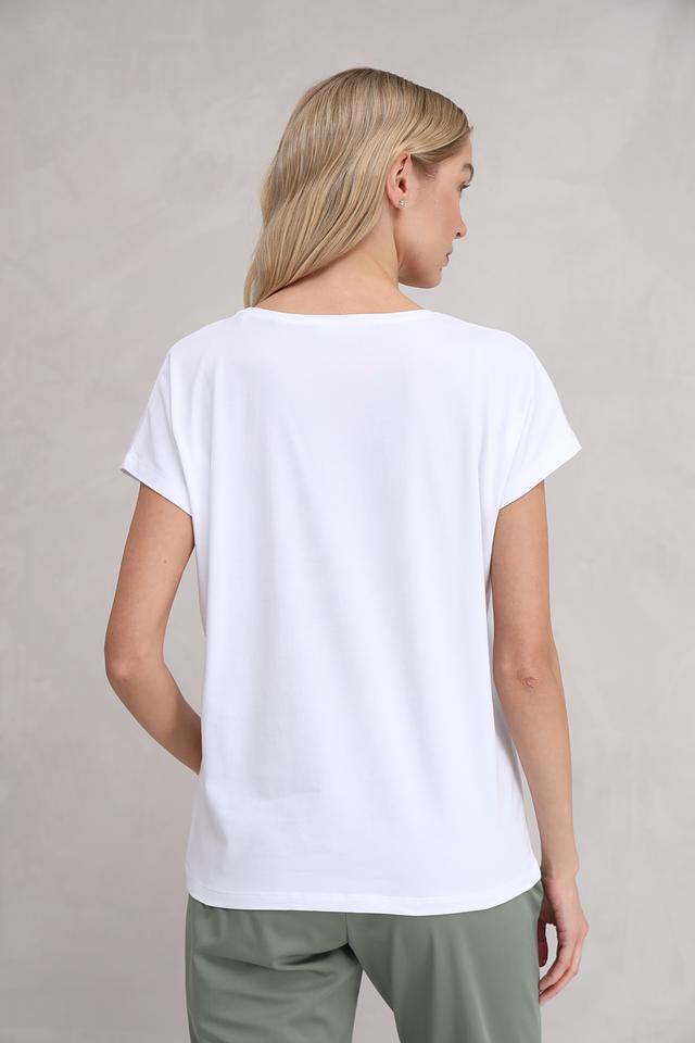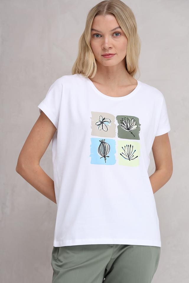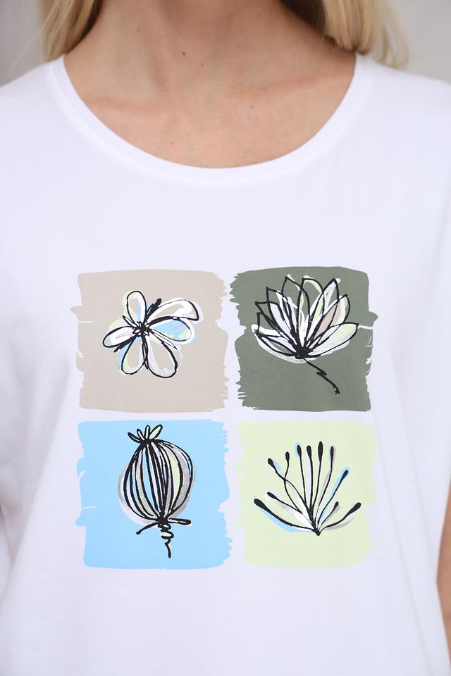 Белая футболка Bianca с оригинальным цветочным принтом – стильное и комфортное решение для повседневного образа. Изготовлена из мягкого хлопка с добавлением эластана для удобства носки и сохранения формы. Состав: хлопок 92%, эластан 8%