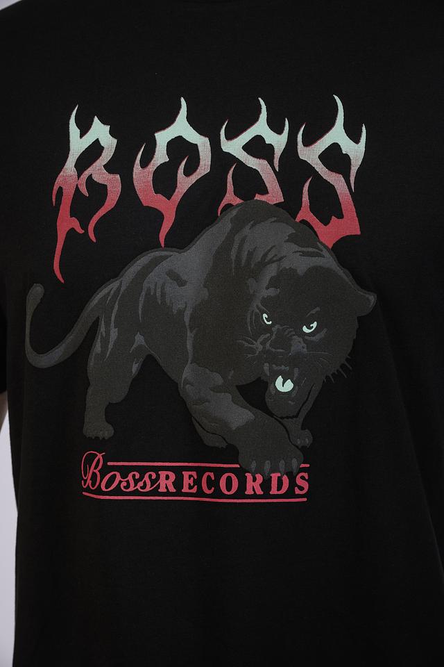 Основным элементом дизайна является крупный, детализированный принт с изображением пантеры и надписью "BOSS", выполненный в красных тонах. Под принтом расположена надпись "BossRecords".