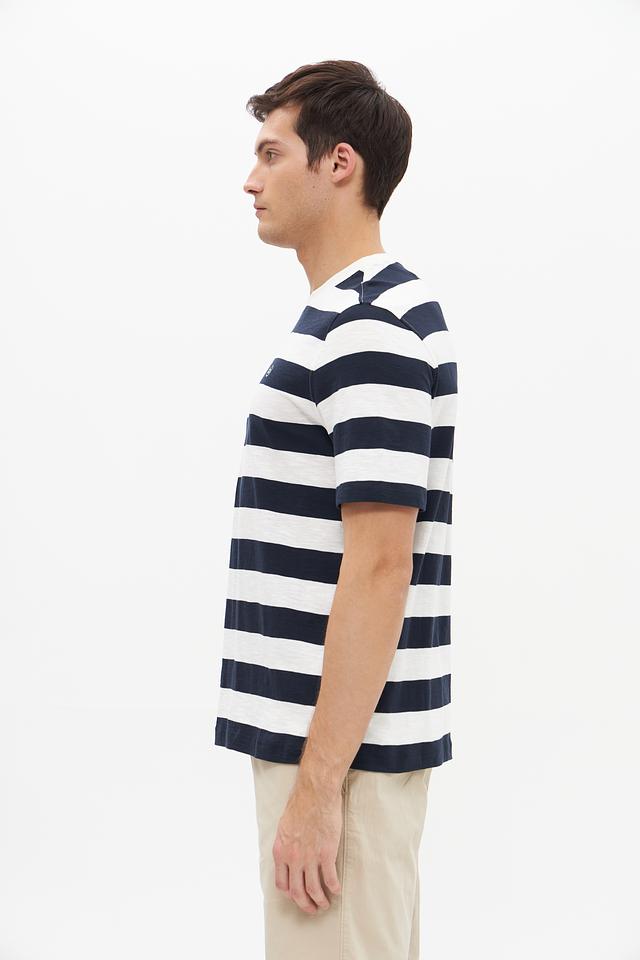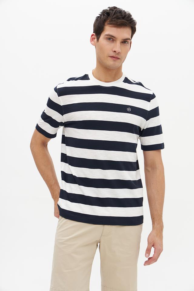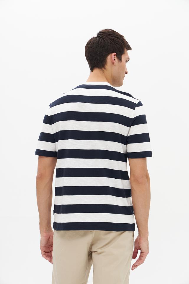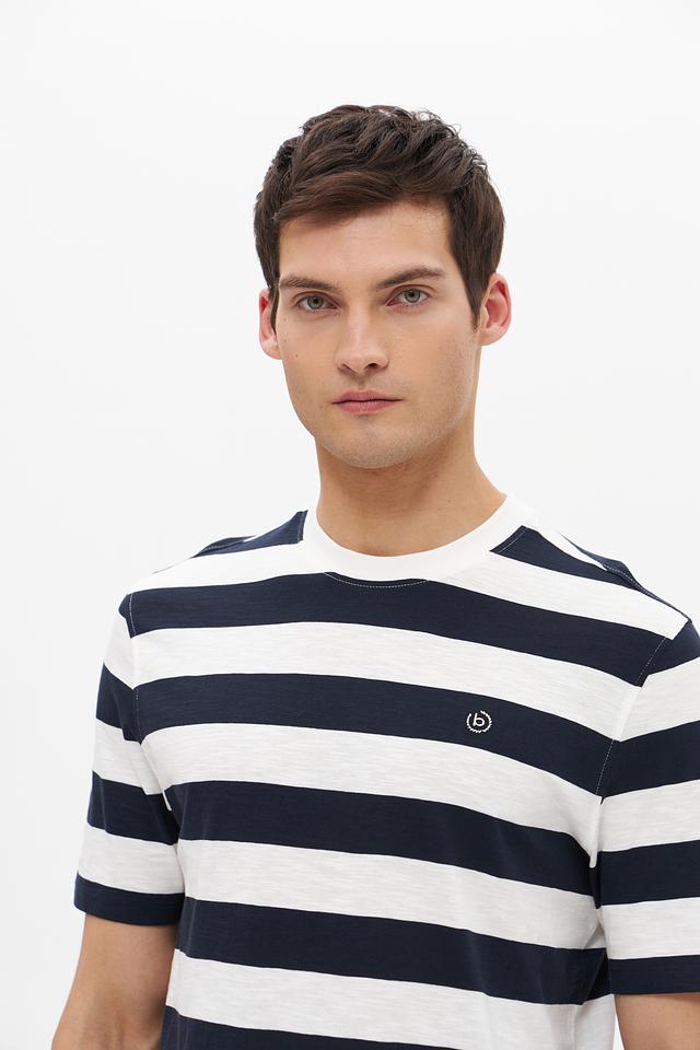 Эта мужская футболка от Bugatti выполнена в стильном дизайне с чередованием синих и белых полос. Классический крой и круглый вырез горловины делают ее универсальной для различных образов.