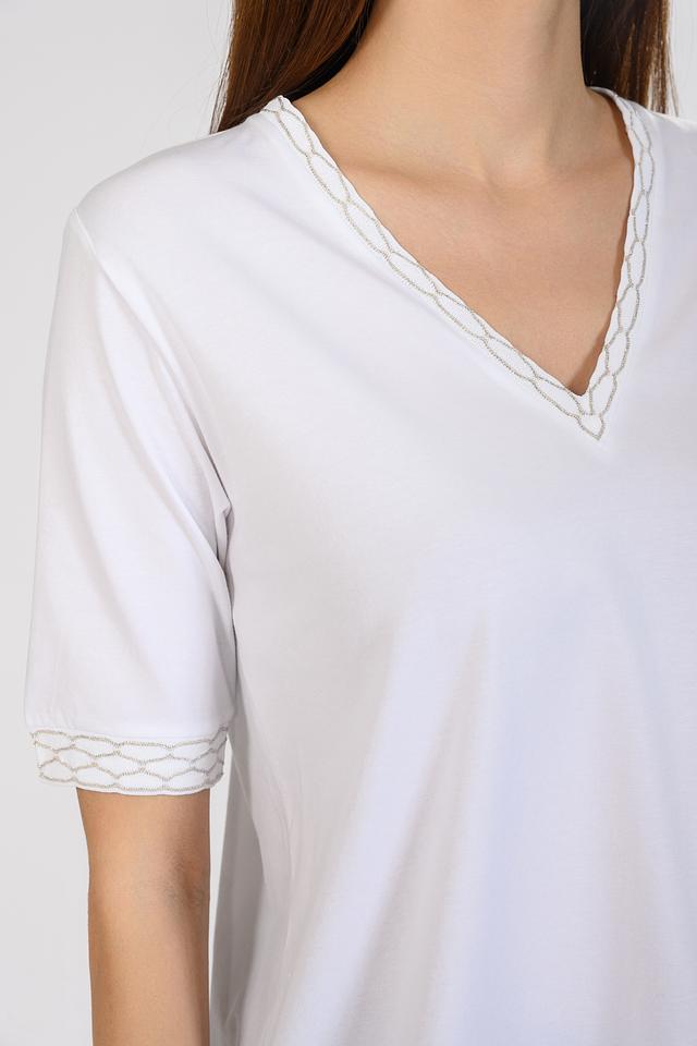 Белая футболка D. Exterior женского силуэта с V-образным вырезом и деликатной отделкой. Модель выполнена из мягкой вискозы с добавлением полиамида и полиэстера для комфорта и износостойкости. Состав: вискоза 78%, полиамид 16%, полиэстер 6%