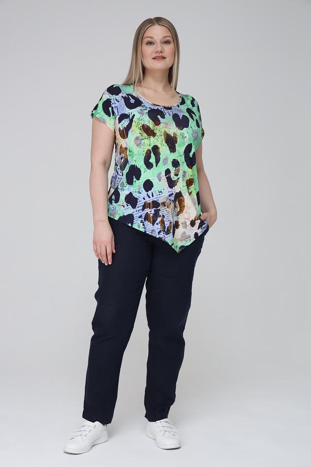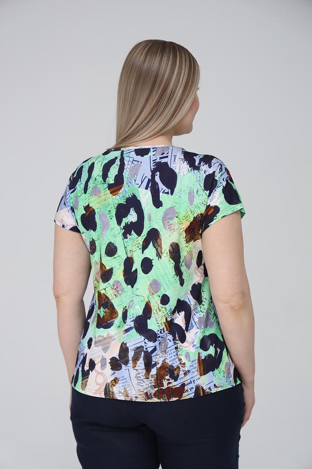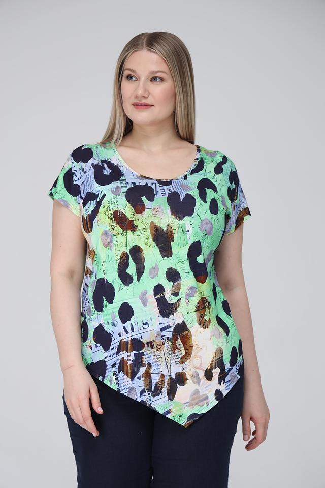 Футболка имеет прямой крой и короткие рукава. Главная особенность модели – эффектный принт, сочетающий в себе леопардовые пятна и элементы газетного текста на зеленом фоне. Асимметричный подол добавляет оригинальности силуэту.