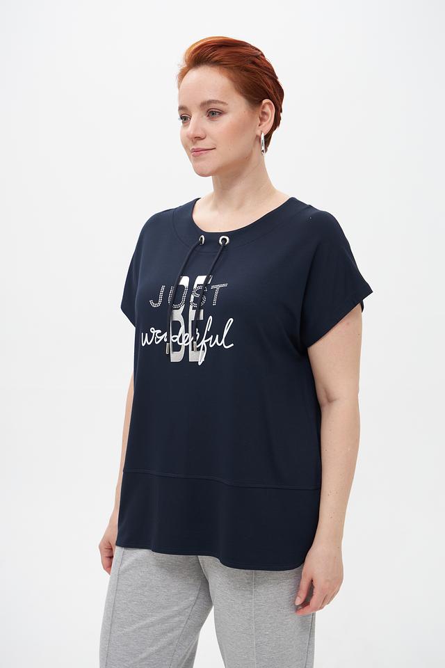 Женская футболка от Doris Streich темно-синего цвета с надписью и шнурками на горловине. Изготовлена из вискозы с добавлением эластана для комфорта и хорошей посадки. Состав: вискоза 95%, эластан 5%
