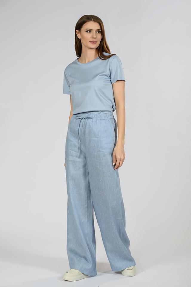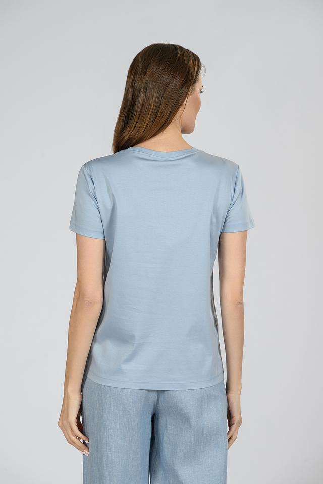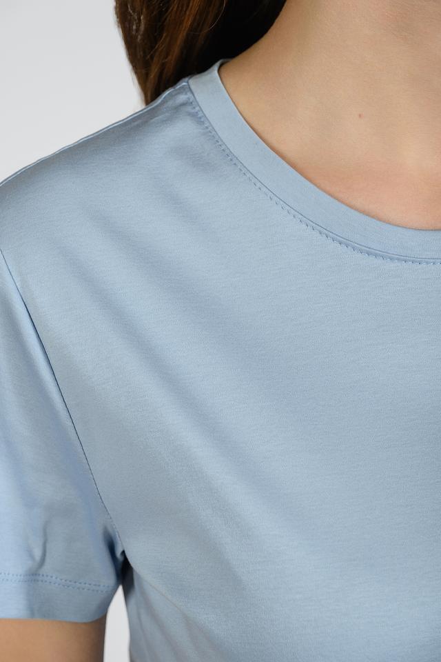 Цвет футболки – нежный голубой, который легко сочетается с другими элементами гардероба. Круглый вырез горловины и короткие рукава делают эту модель идеальной для теплой погоды.