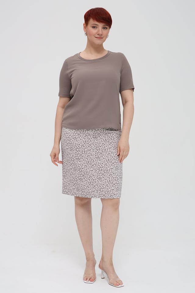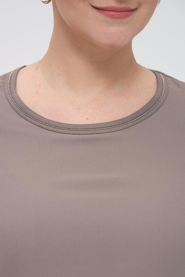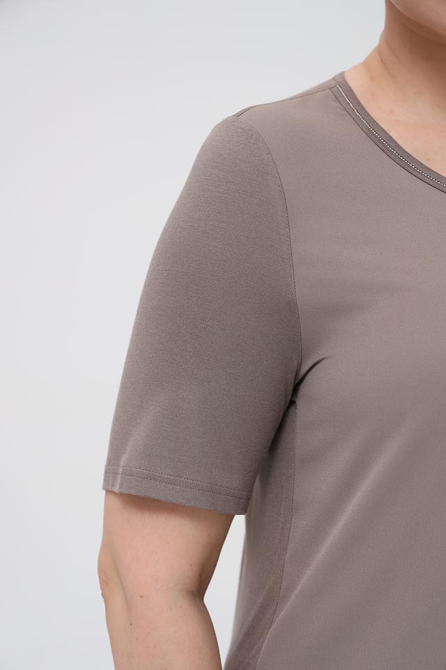 Особенностью данной модели является деликатная отделка горловины тонкой тесьмой, которая добавляет изысканности простому дизайну. Благодаря своему универсальному серому цвету, эта футболка легко сочетается с различными элементами гардероба – от джинсов и юбок до брюк и жакетов.