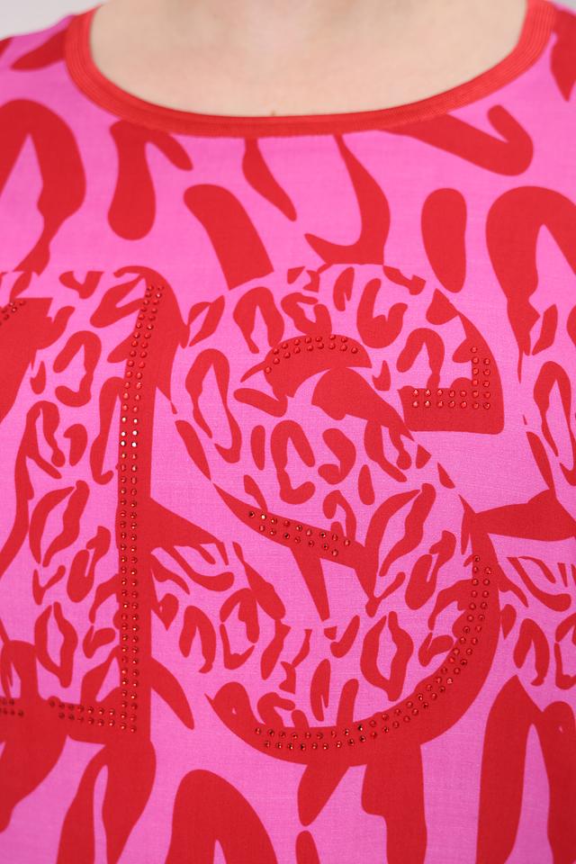 Женская футболка Frapp ярко-розового цвета с оригинальным принтом в виде губ. Модель свободного кроя с короткими рукавами выполнена из мягкой вискозы с добавлением эластана для комфорта и лучшей посадки. Состав: вискоза 90%, эластан 10%