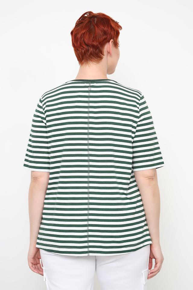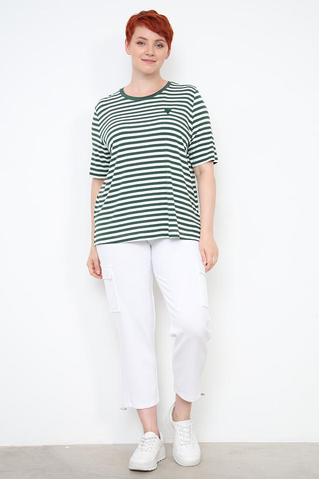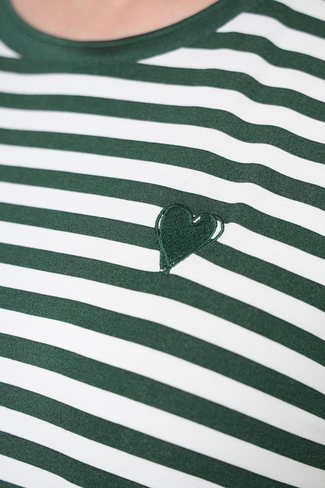 Футболка имеет классический прямой крой и короткий рукав, что делает её универсальной для различных образов. Зелёно-белая полоска придает ей свежий и динамичный вид. Небольшая вышивка в виде сердца на груди добавляет изюминку и оригинальность.