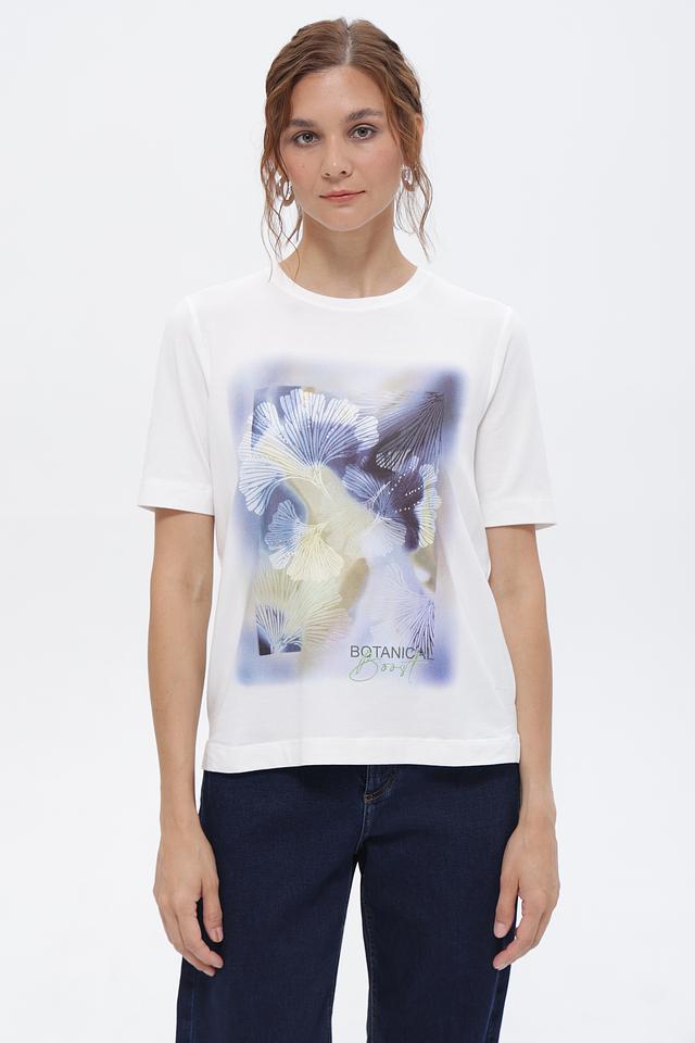 Белая футболка Gerry Weber с оригинальным цветочным принтом. Изготовлена из мягкого и приятного к телу материала на основе хлопка и модала. Стильный и комфортный вариант для повседневного образа. Состав: хлопок 47%, модал 47%, эластан 6%