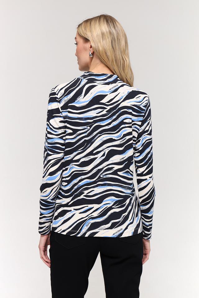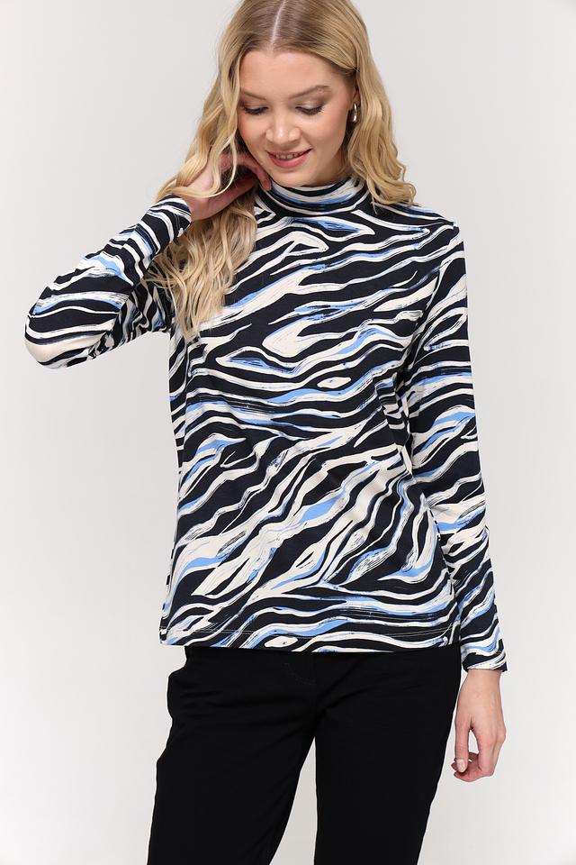 Футболка имеет прямой крой и удобный воротник-стойка. Главная особенность модели – эффектный абстрактный принт в синих, белых и черных тонах, который придаёт ей современный и динамичный вид. Принт выполнен в виде размытых мазков, напоминающих мраморные разводы.
