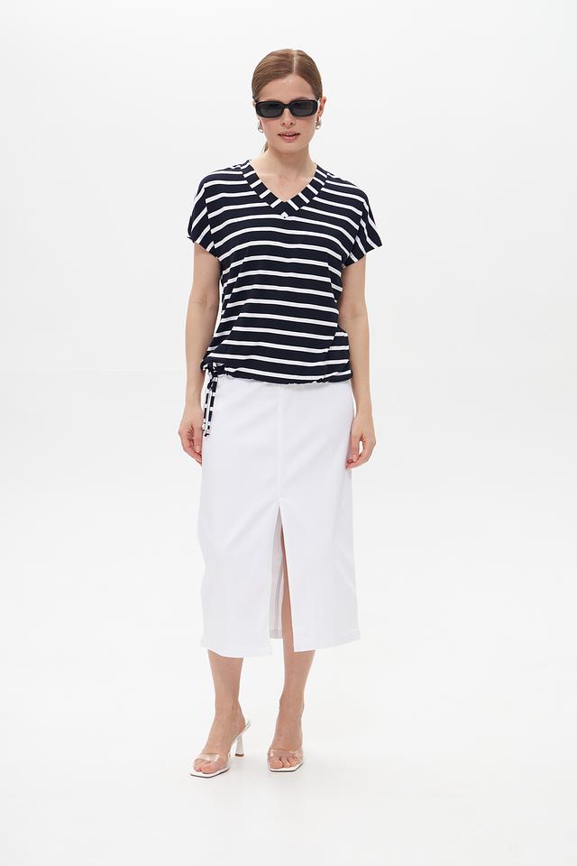 Футболка имеет свободный крой, не сковывающий движений, и подчеркивает женственность силуэта. Боковые сборки на талии с тонкими завязками позволяют регулировать посадку по фигуре и создавать более акцентированный образ.