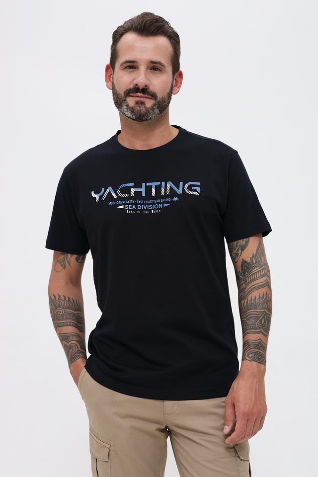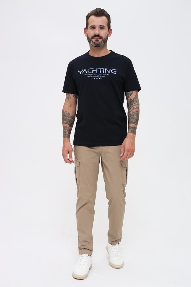 Основным элементом дизайна является крупный белый принт "Yachting", выполненный в современном стиле. Принт дополнен графическими элементами и надписями, придающими футболке динамичный вид.