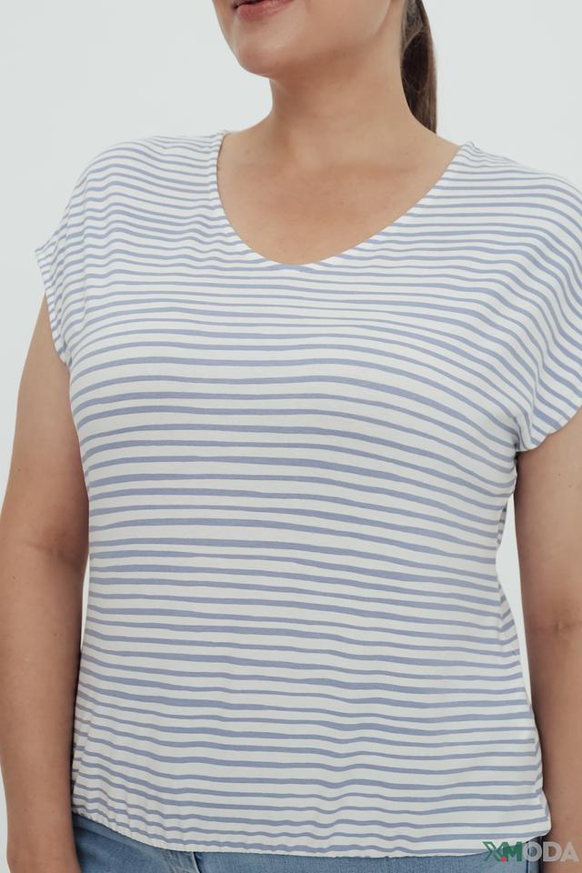 Футболка имеет прямой крой и короткие рукава, что обеспечивает свободу движений и комфорт в жаркую погоду. V-образный вырез горловины подчеркивает женственность силуэта.