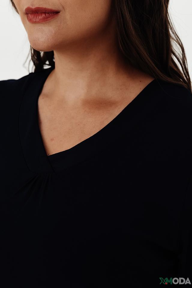 Модель выполнена из высококачественной вискозы с добавлением эластана, что обеспечивает приятные тактильные ощущения, комфорт при носке и хорошую посадку по фигуре. V-образный вырез визуально удлиняет шею и делает образ более женственным.