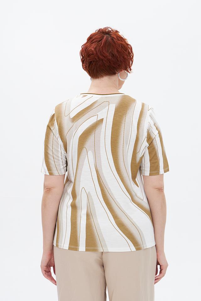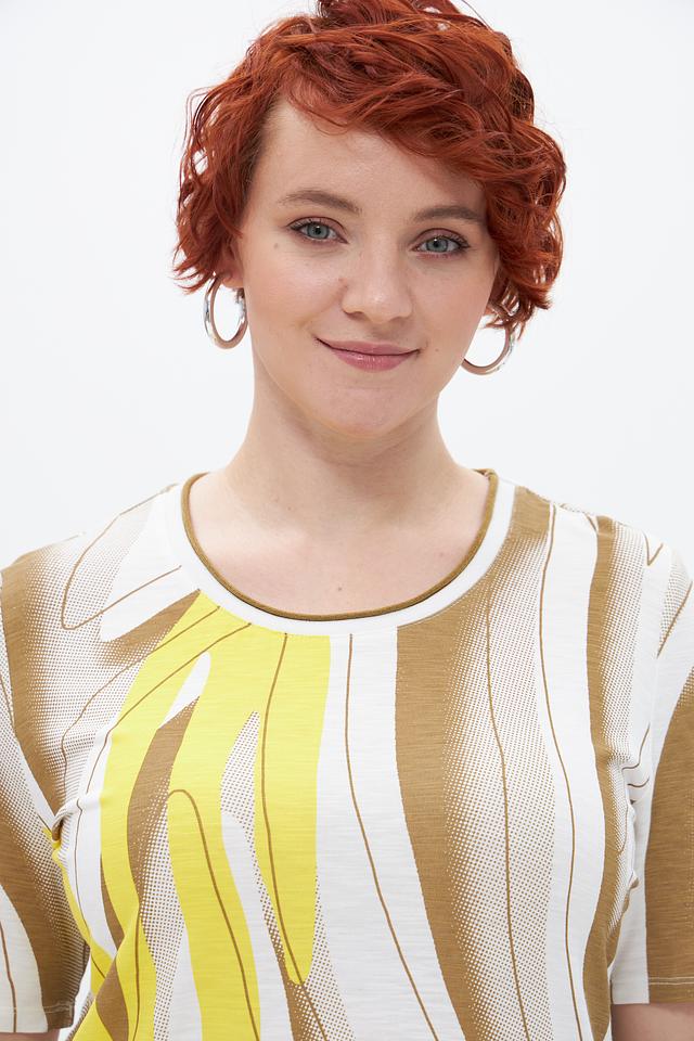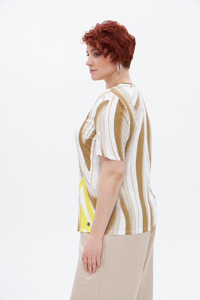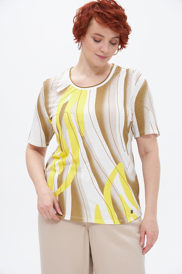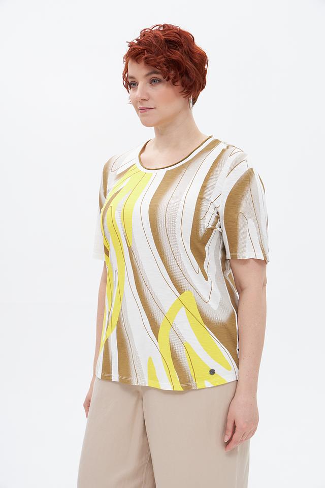 Основной цвет футболки — бежевый, но ярким акцентом является абстрактный принт, сочетающий в себе жёлтые и белые оттенки. Принт выполнен в виде плавных, изогнутых линий, придающих изделию оригинальность и современный вид.