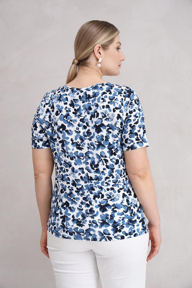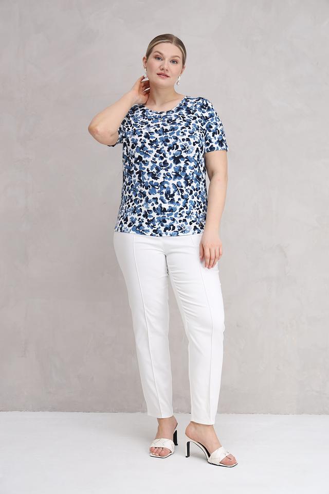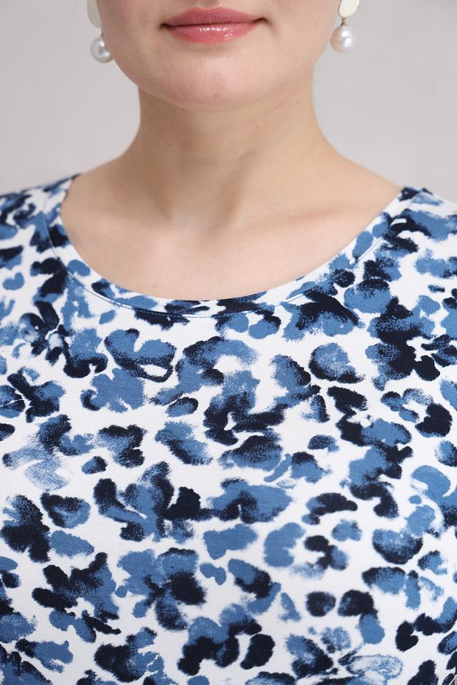 Футболка имеет классический крой и короткий рукав, что делает ее универсальной для различных случаев. Главной особенностью модели является яркий и стильный цветочный принт в синих тонах, который добавит образу женственности и легкости.