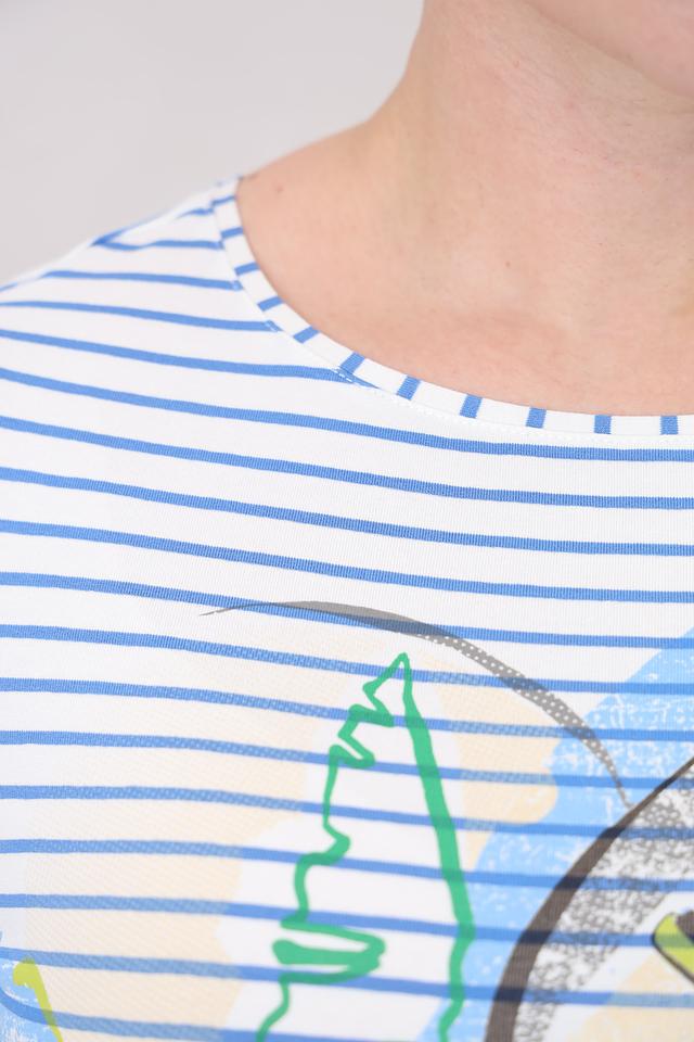 Футболка имеет классический крой с короткими рукавами и округлым вырезом горловины. Главная особенность модели – яркий и оригинальный принт с изображением цветов и растительных элементов, выполненный в голубых, зеленых и желтых тонах. Голубо-белая полоска добавляет свежести и легкости.