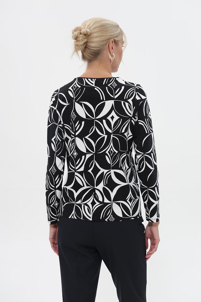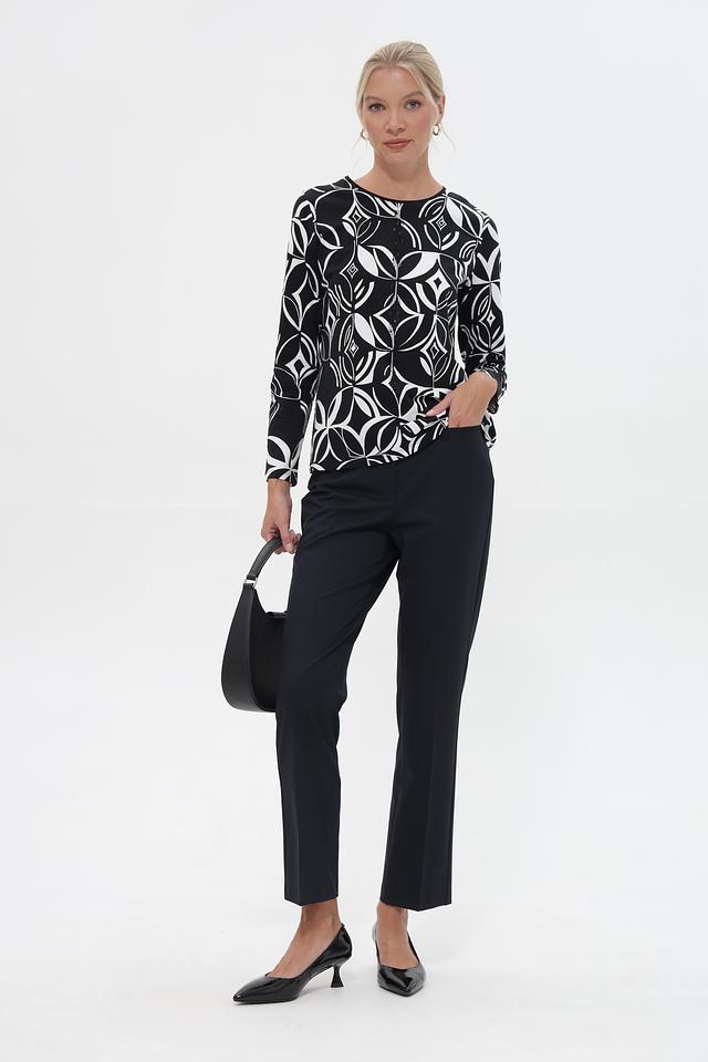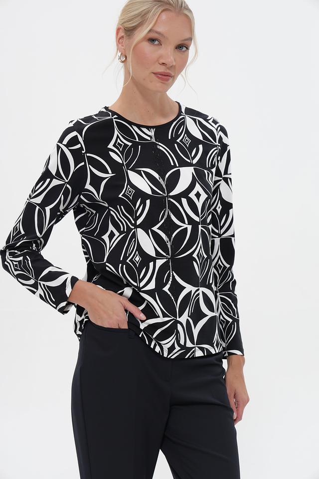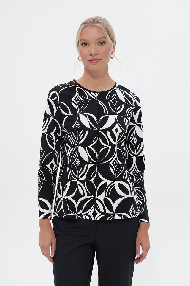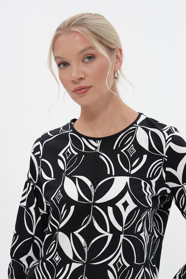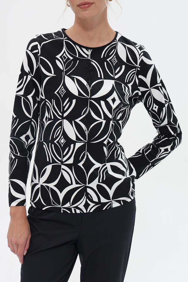 Женская футболка Barbara Lebek чёрного цвета с оригинальным геометрическим принтом. Модель выполнена из мягкого хлопка с добавлением модала для комфорта и приятных тактильных ощущений. Состав: хлопок 95%, модал 5%